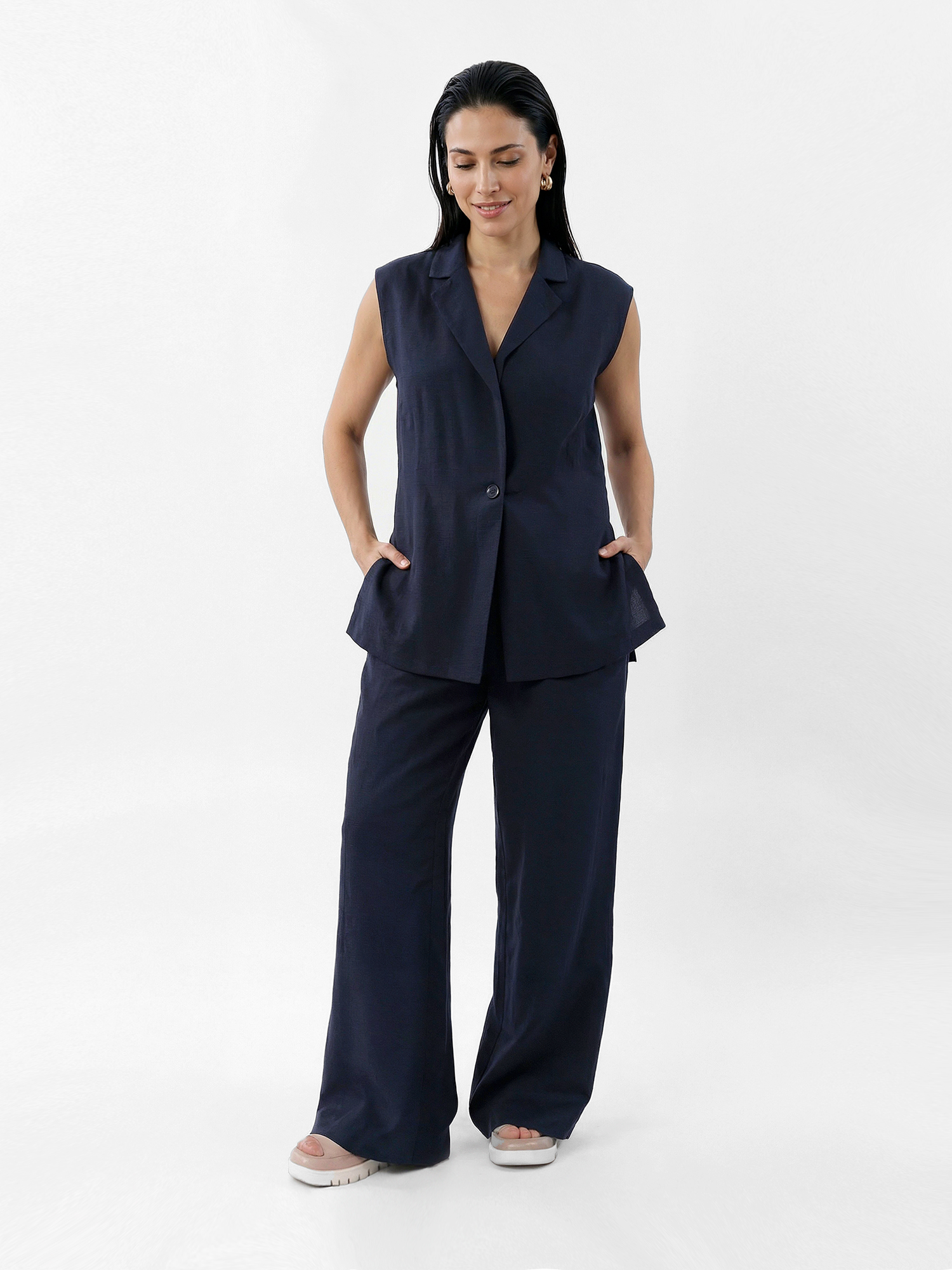 Эта модель отлично подходит для летнего casual-гардероба, ее можно смело сочетать с различными моделями брюк – прямой классикой, палаццо, зауженными или даже шортами. Жилет отлично комбинируется с различными аксессуарами, включая шейные платки.