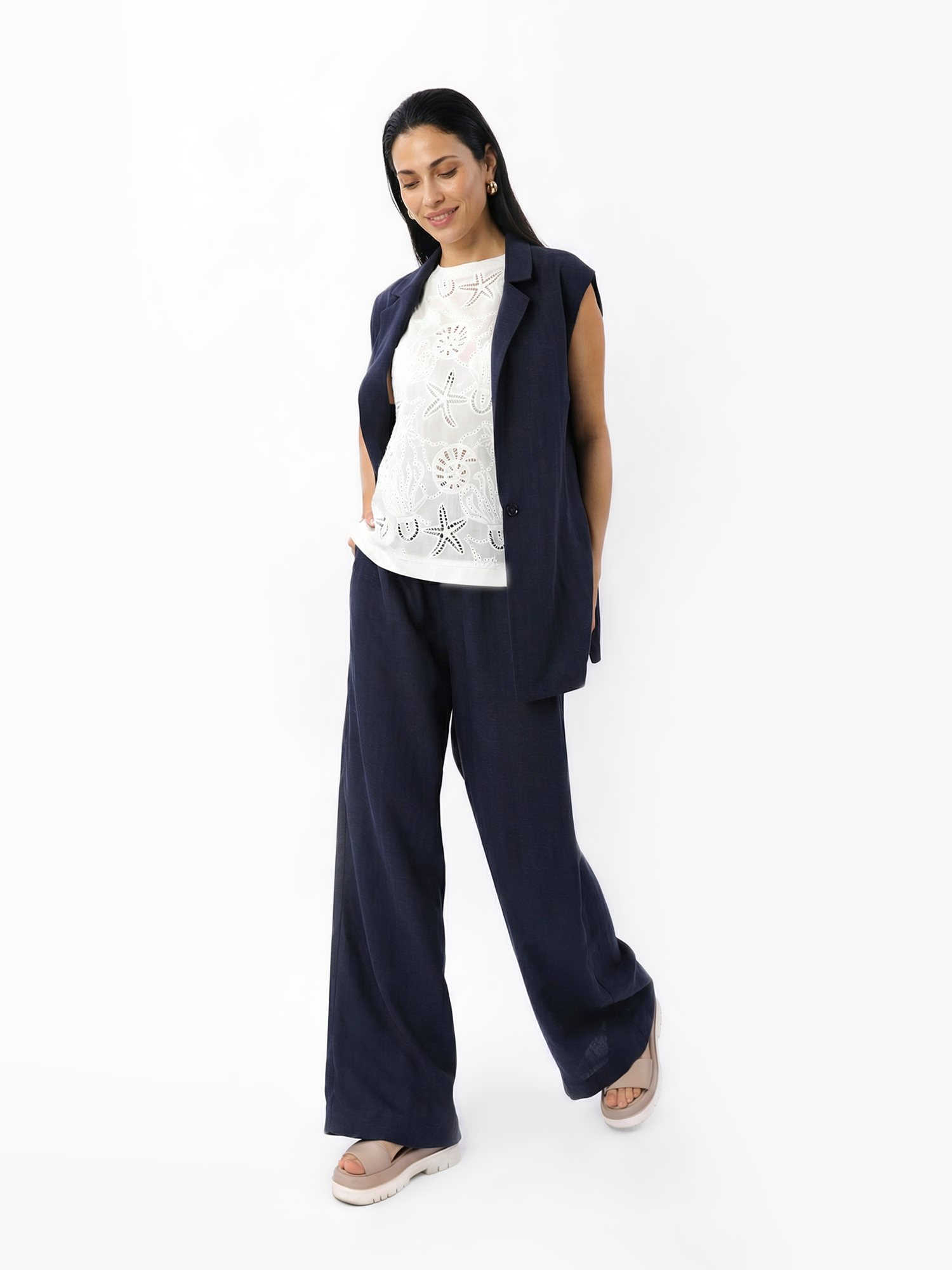 Широкие брюки из сочетания двух дышащих материалов – льна и тенселя отлично подходят для жаркой погоды; сборка на поясе делает акцент на линии талии. Модель будет хорошо сочетаться как с облегающим верхом, так и со свободными блузами и футболками.
