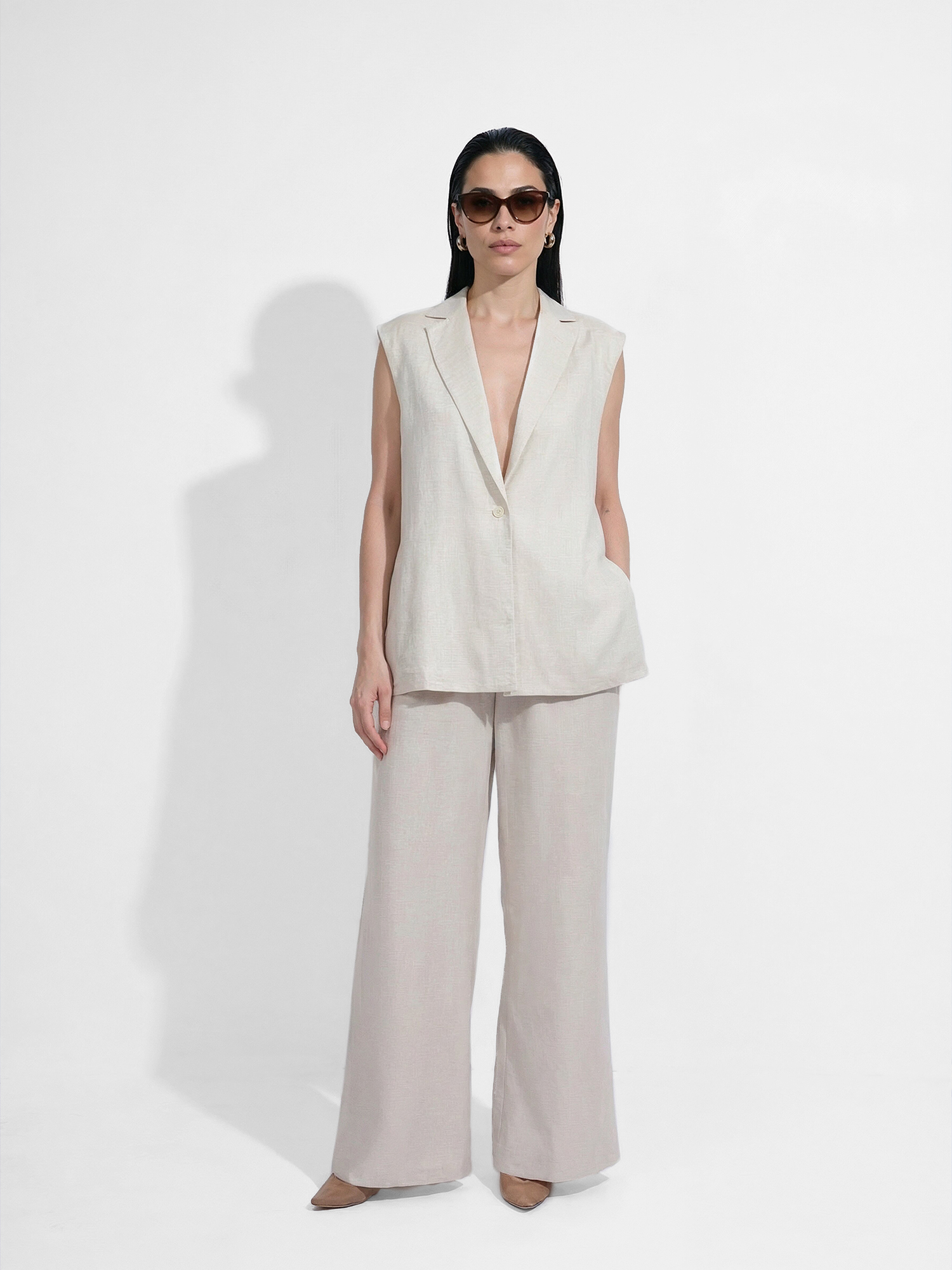 Широкие брюки из сочетания двух дышащих материалов – льна и тенселя отлично подходят для жаркой погоды; сборка на поясе делает акцент на линии талии. Модель будет хорошо сочетаться как с облегающим верхом, так и со свободными блузами и футболками.