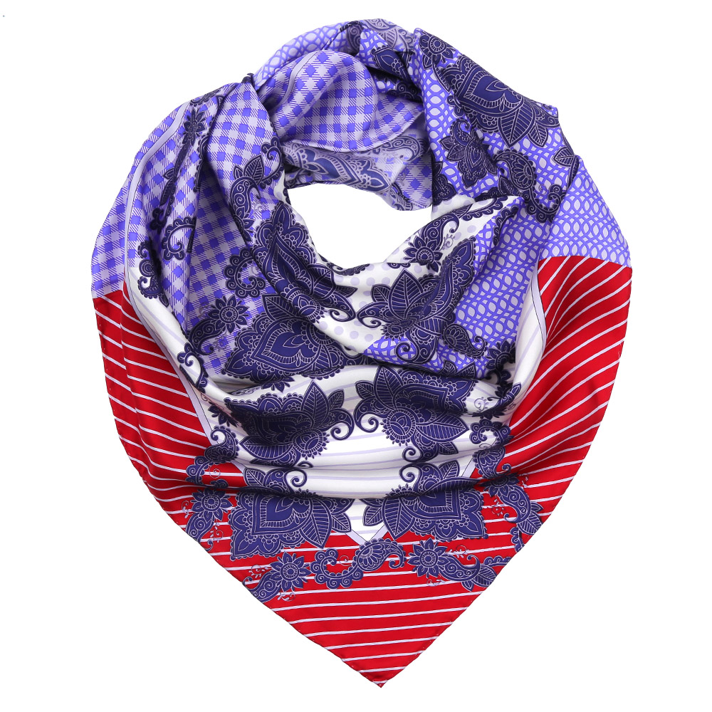 Грациозный женский платок от итальянского бренда Fabretti выполнен из натурального шелка, который придает изделию неповторимый роскошный блеск и гладкость фактуры. Тонкая и прочная нить, создающая струящуюся ткать, подчеркнет изысканный вкус своей обладательницы. Дизайнерское сочетание красного, фиолетового и коричневого оттенков превратили модель в элегантное изделие, которое станет броским аксессуаром в любом современном образе. Изысканный принт, сочетающий в себе геометрический рисунок, модный орнамент в стиле барокко, позволил дизайнерам создать настоящий шедевр, который станет изюминкой Вашего наряда.