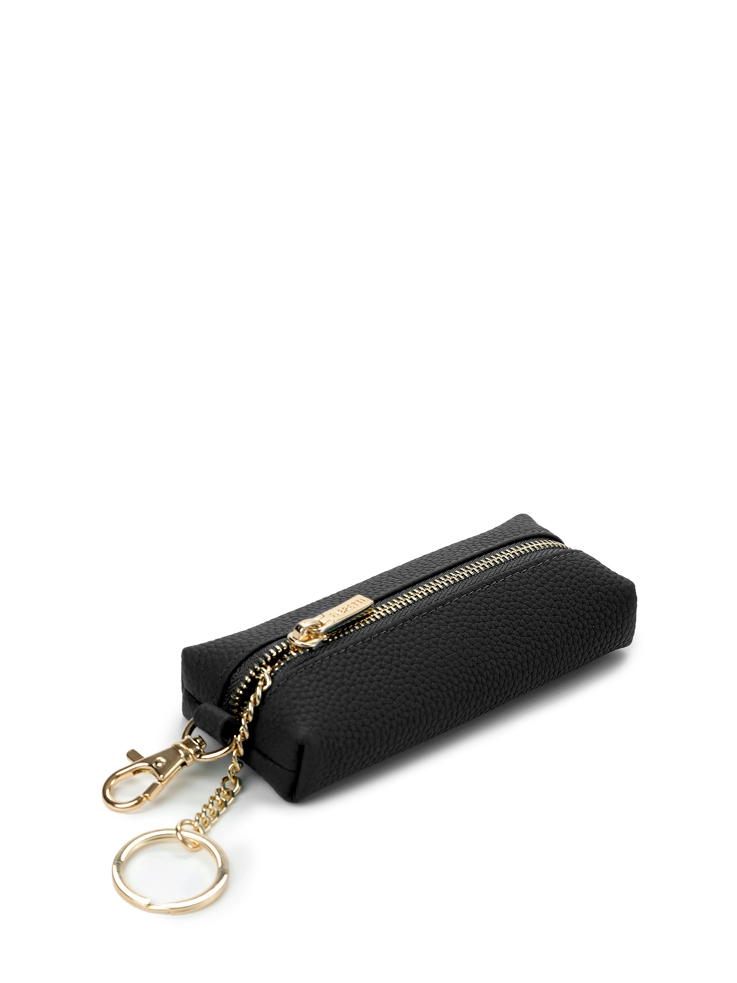 Внутри одно отделение для ключей и удобный металлический держатель на цепочке. На внешней стороне предусмотрен карабин. Аксессуар закрывается на металлическую молнию. Цвет фурнитуры – золото.