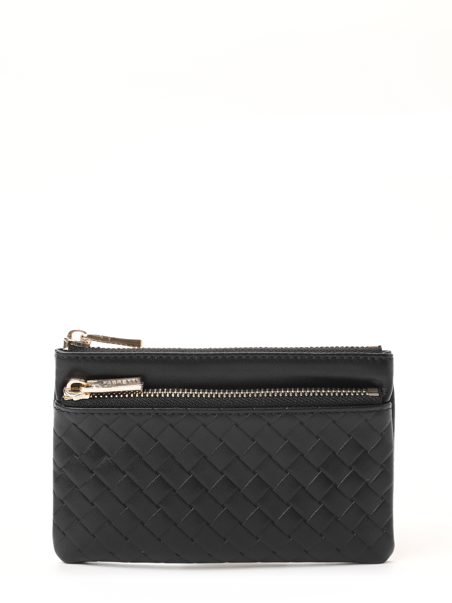 Основное отделение застегивается на молнию, внутри оно дополнено металлическим кольцом для ключей на цепочке и тремя слотами для карт. Второе отделение на лицевой стороне застегивается на молнию. Цвет фурнитуры – золото.