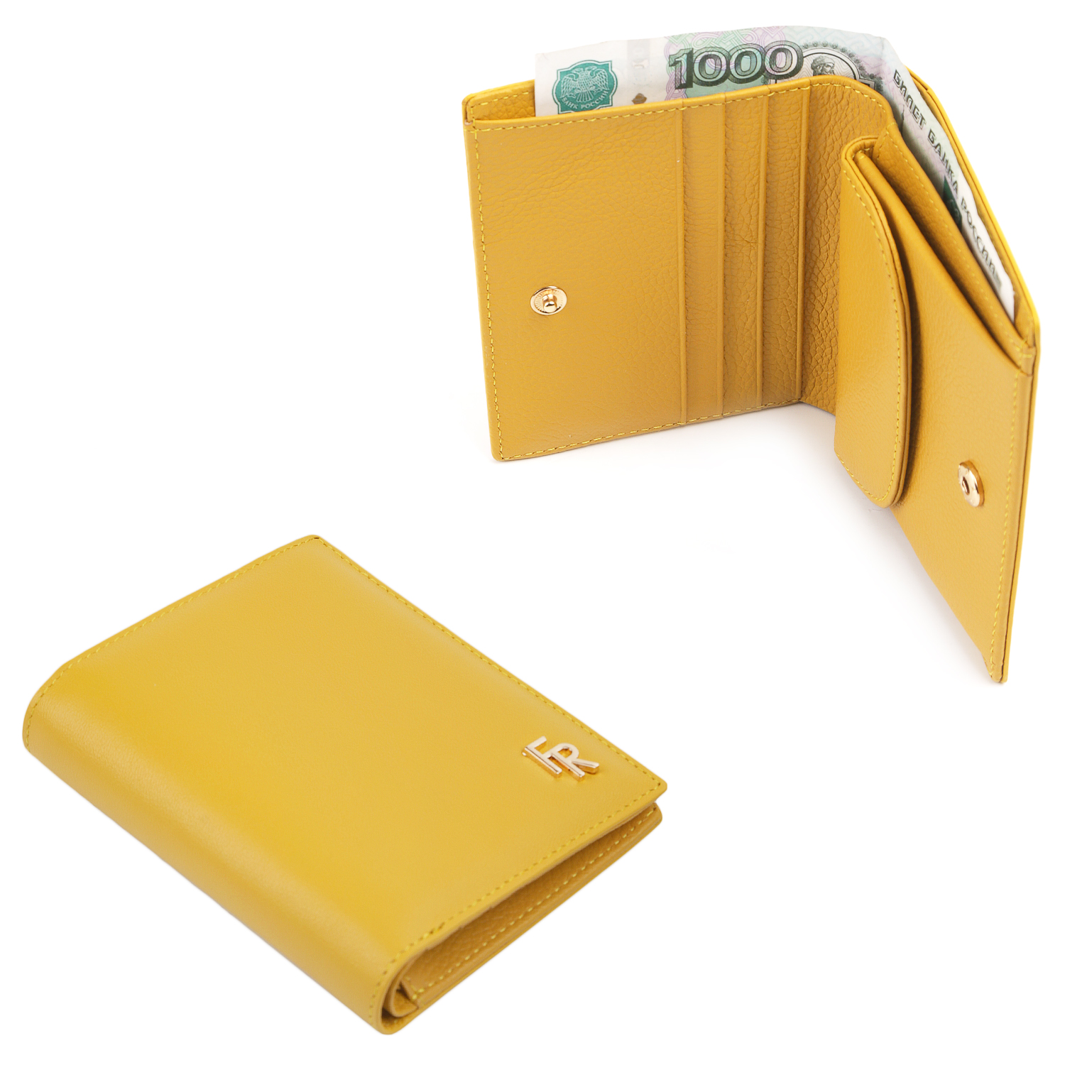 Аксессуар закрывается на кнопку. Внутри 1 отделение для купюр, карман для монет, закрывающийся клапаном на кнопке, 5 слотов для дисконтных и банковских карт. Цвет фурнитуры - золото.