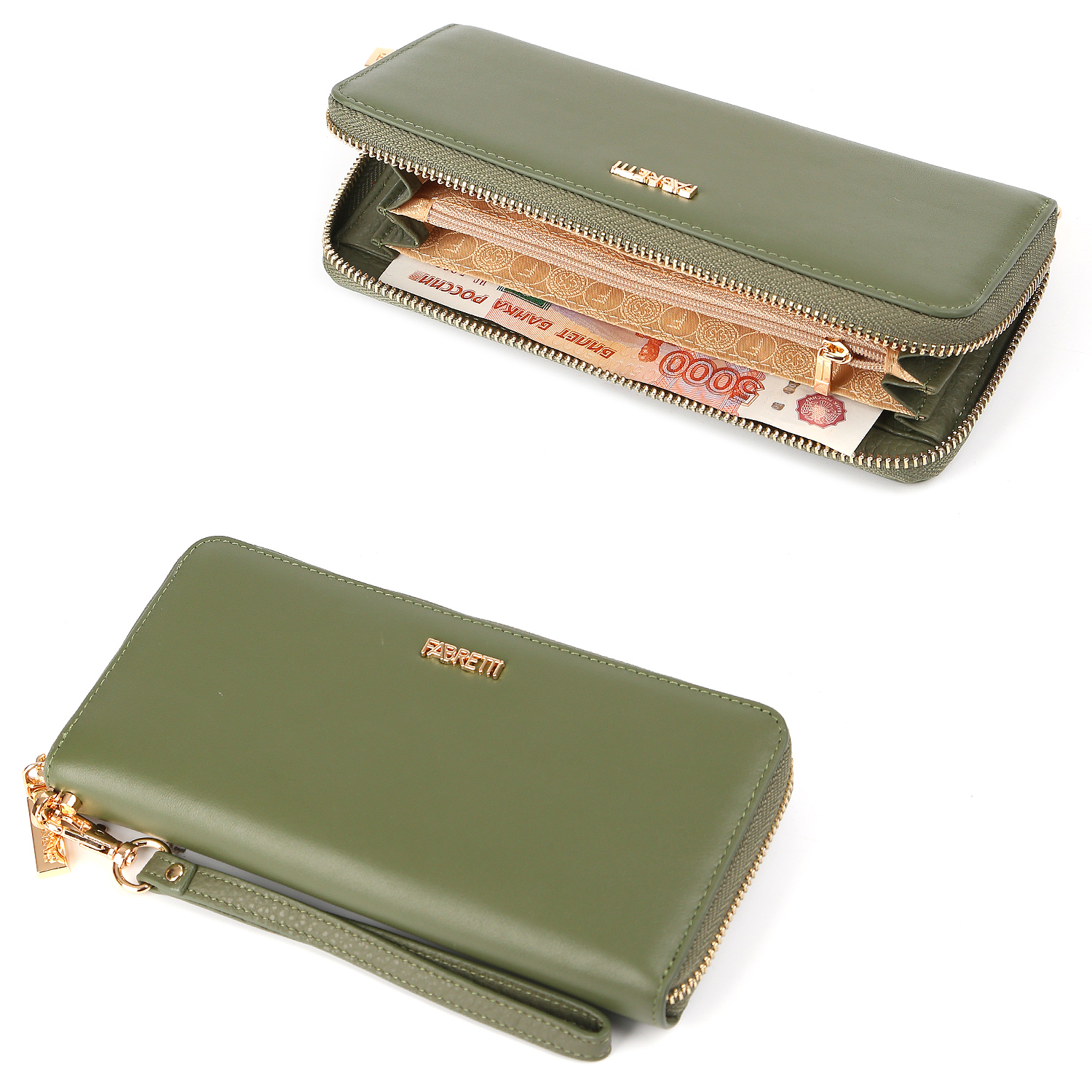 Вместительный женский кошелек FABRETTI в оливковом оттенке выполнен из натуральной кожи гладкой фактуры. Основное отделение закрывается на полукруглую молнию. Внутри 4 отделения на полную купюру, карман на молнии - для мелочи, 1 слот с прозрачной пленкой для проездного или пропуска, 2 открытых боковых кармана и 8 слотов для банковских карт. На тыльной стороне расположен карман быстрого доступа на молнии. Практичный аксессуар дополнен удобным съемным ремешком и при необходимости может выполнить функцию клатча, поскольку с легкостью вместит паспорт, смартфон и другие мелочи. Цвет фурнитуры - золото.