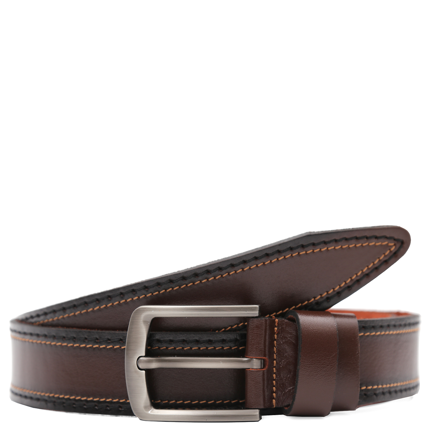 Мужской ремень LEO VENTONI подойдет и к джинсам, и к брюкам в стиле casual. Модель изготовлена из мягкой натуральной кожи изысканного темно-коричневого цвета, переходящего в черный по краям. В качестве декора выступают отстрочки на тон темнее и светлее - по две с каждого края. Тыльная сторона - из натуральной кожи естественной фактуры. Стильный аксессуар дополнен прямоугольной пряжкой с покрытием черненый никель. Две широкие шлевки из гладкой кожи в тон изделию: одна закреплена, вторая - подвижная.