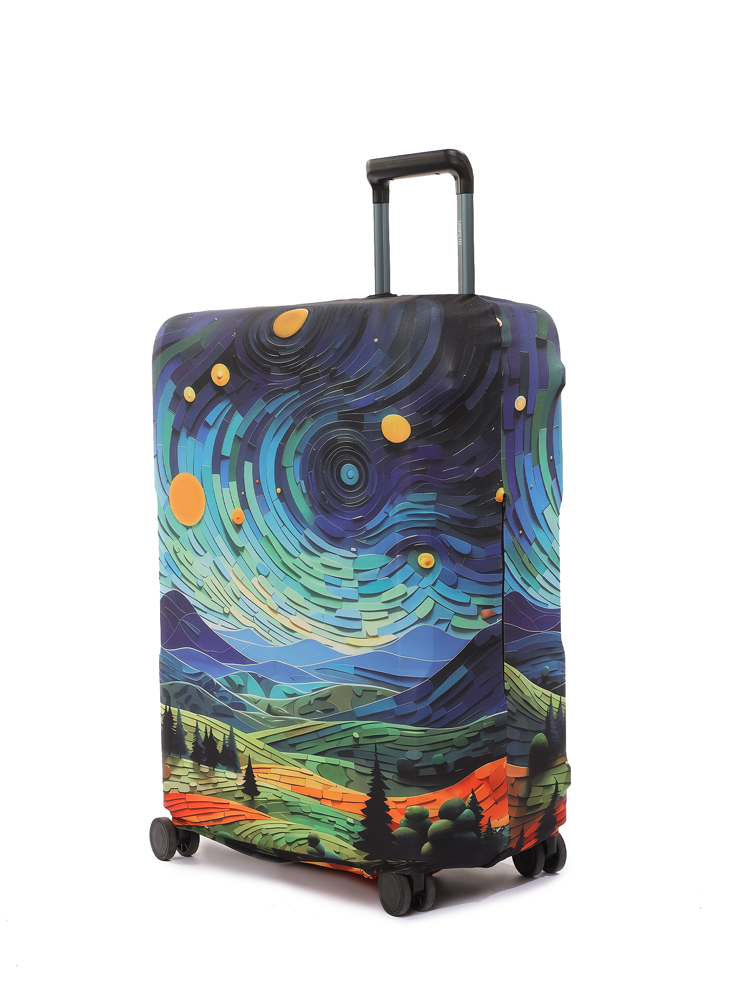 Стильный чехол итальянского бренда FABRETTI с ярким цветным пейзажным принтом подойдет для чемодана среднего размера M. Созданный из высокотехнологичного полиэстера и спандекса, он эластичен, вынослив и прост в уходе. Чехол поможет защитить багаж от загрязнений и царапин. Кроме того, сэкономит время и деньги на упаковке чемодана в багажную пленку в аэропорту. Благодаря оригинальному дизайну чемодан будет легко найти на багажной ленте в аэропорту.