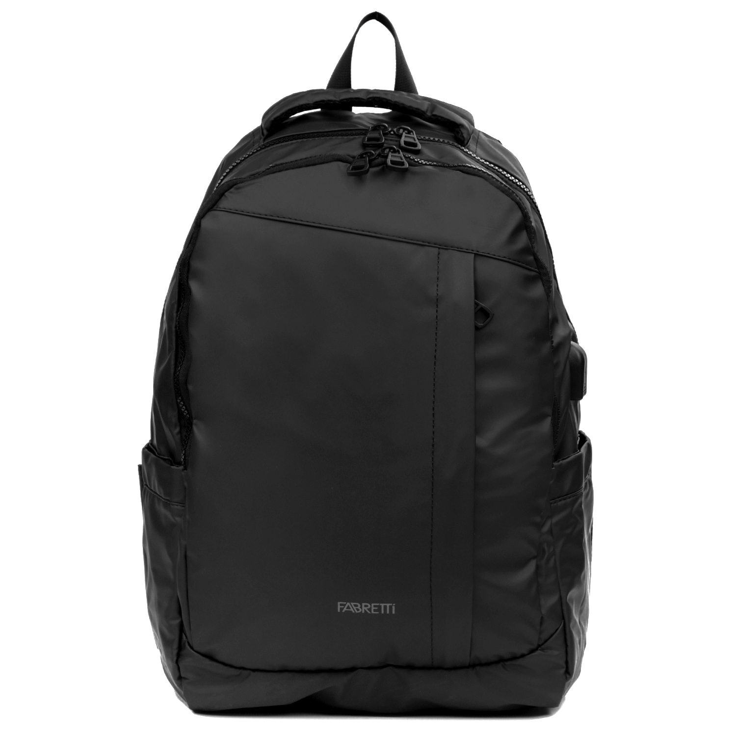 Стильный вместительный черный рюкзак FABRETTI выполнен из влагостойкого гладкого нейлона и оснащен USB-кабелем и USB-портом. Удобная мягкая спинка, создает дополнительный комфорт при ношении. Мягкие регулирующиеся по длине лямки имеют особую форму и конструкцию, что способствует комфорту во время носки. Рюкзак состоит из двух отделений, которые закрываются на пластмассовую молнию с двумя поводками. Внутри отделения ближе к спине расположен отдел для ноутбука и usb-кабель. Во втором отделении расположены открытый настенный карман, а также сетчатый карман на молнии для хранения мелочей и три отдела для ручек. На фронтальной части есть карман на молнии, куда помещается планшет. Также имеются два боковых кармана быстрого доступа и потайной карман на спинке. Сверху изделия – уплотненная удобная ручка. Рюкзак прекрасно подойдёт для прогулок по городу, велосипедных поездок или путешествий и поможет обеспечить бесперебойную работу необходимых гаджетов.