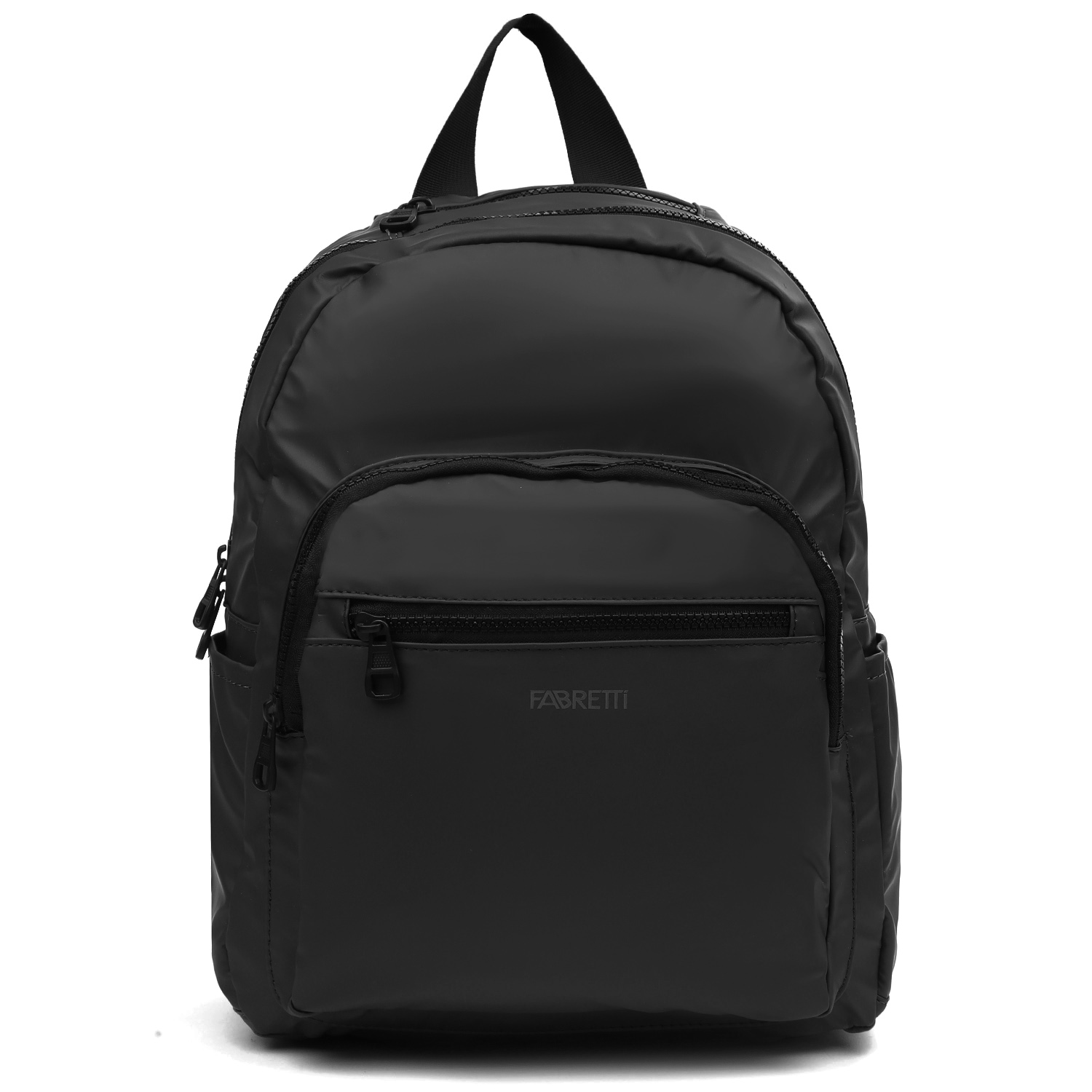 Вместительный текстильный рюкзак FABRETTI в черном цвете выполнен из влагостойкого гладкого нейлона. Удобная мягкая спинка, создает дополнительный комфорт при ношении. Основное отделение закрывается на молнию с 2 бегунками. Внутри предусмотрена продуманная система карманов: 2 открытых, 1 на молнии и отделение, куда поместится планшет или электронная книга. На лицевой стороне есть 2 вместительных кармана на молнии. Также имеются два боковых кармана быстрого доступа и карман быстрого доступа сверху. Изделие дополняет удобная текстильная ручка. Текстильные лямки регулируются по длине. Рюкзак прекрасно подойдёт для прогулок по городу, велосипедных поездок или путешествий.