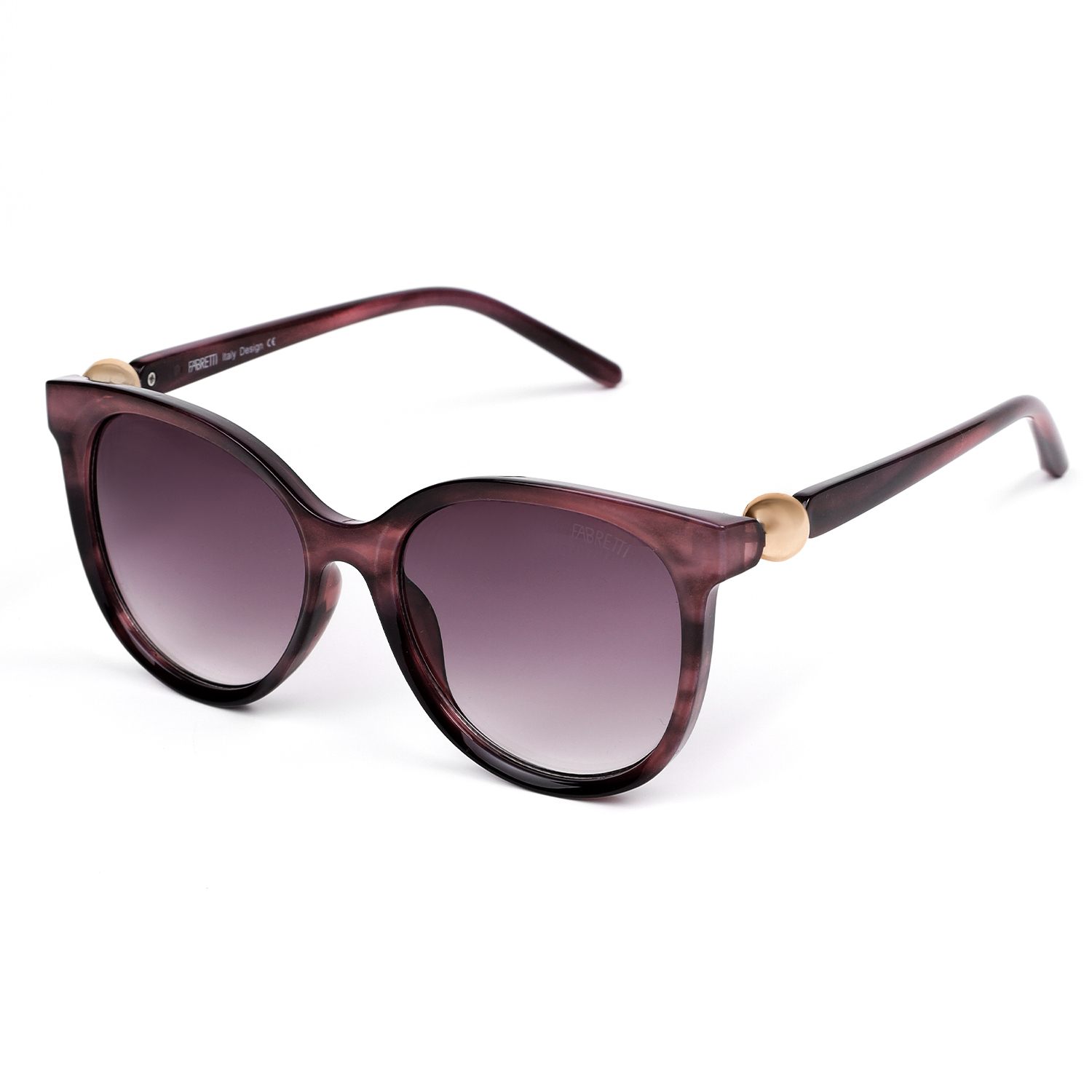 Женские солнцезащитные очки итальянского бренда FABRETTI в округлой полупрозрачной оправе "кошачий глаз" фиолетового цвета с разводами. Градиентные сиреневые линзы позволяют видеть одинаково хорошо как в помещении, так и на солнечной улице.
