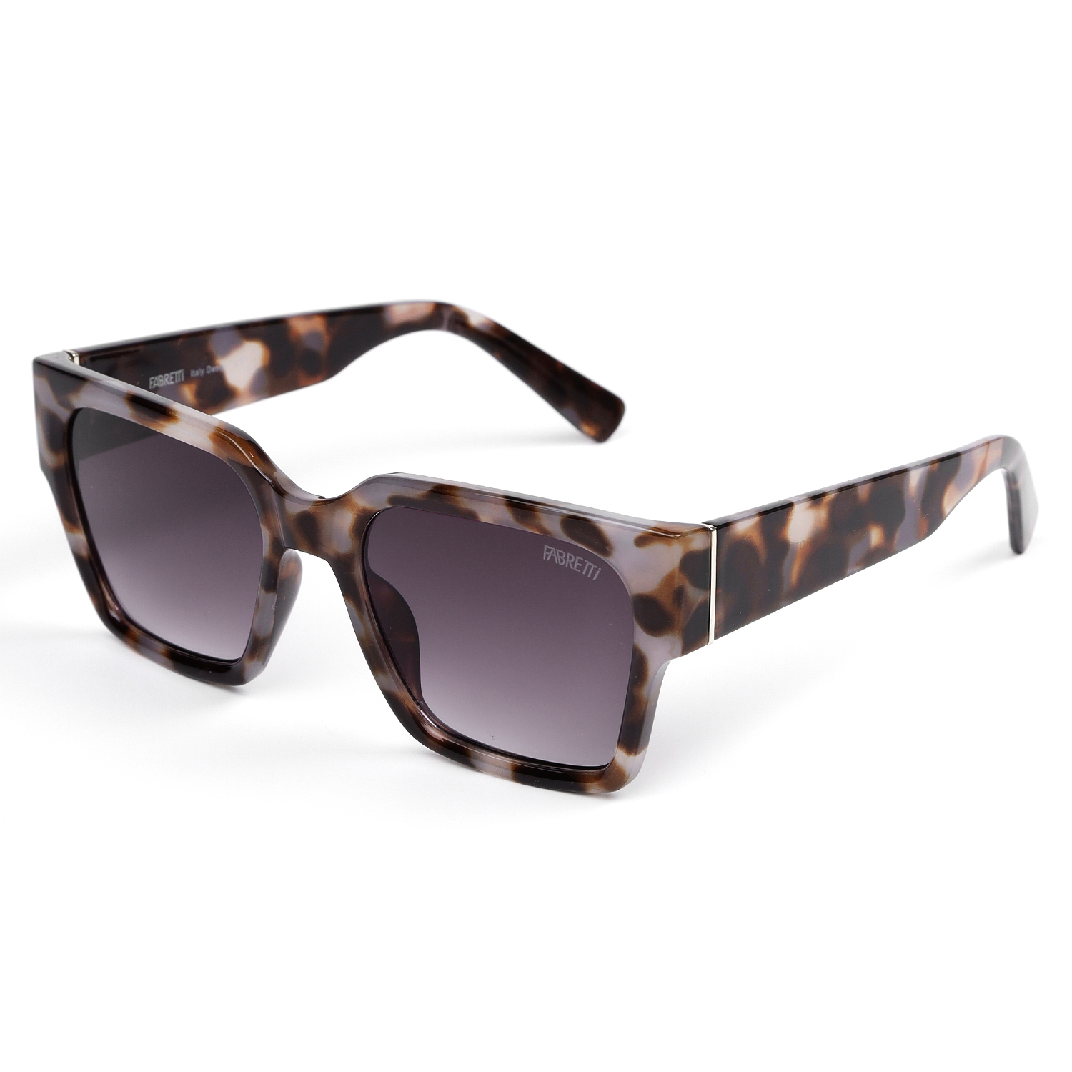 Классические женские солнцезащитные очки итальянского бренда FABRETTI в полупрозрачной серо-коричневой оправе с анималистичным узором.  Градиентные сиреневые линзы позволяют видеть одинаково хорошо как в помещении, так и на солнечной улице.