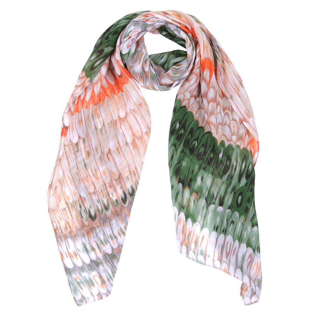 Яркий женский шарф от итальянского бренда Fabretti выполнен из натуральной вискозы, которая придает изделию неповторимую мягкость и шелковистость фактуры. Красочное сочетание зеленого, бежевого и оранжевого цвета позволило дизайнерам создать стильную модель, которая станет изюминкой любого весеннего образа. Уникальный принт в виде изящных перьев и аккуратная обработка края изделия подчеркнут Ваш неповторимый вкус!