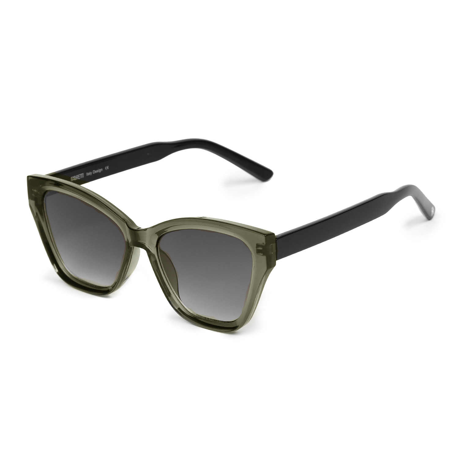 Элегантные солнцезащитные очки итальянского бренда FABRETTI в полупрозрачной зеленой оправе в форме "кошачий глаз". Градиентные серые линзы позволяют видеть одинаково хорошо как в помещении, так и на солнечной улице.