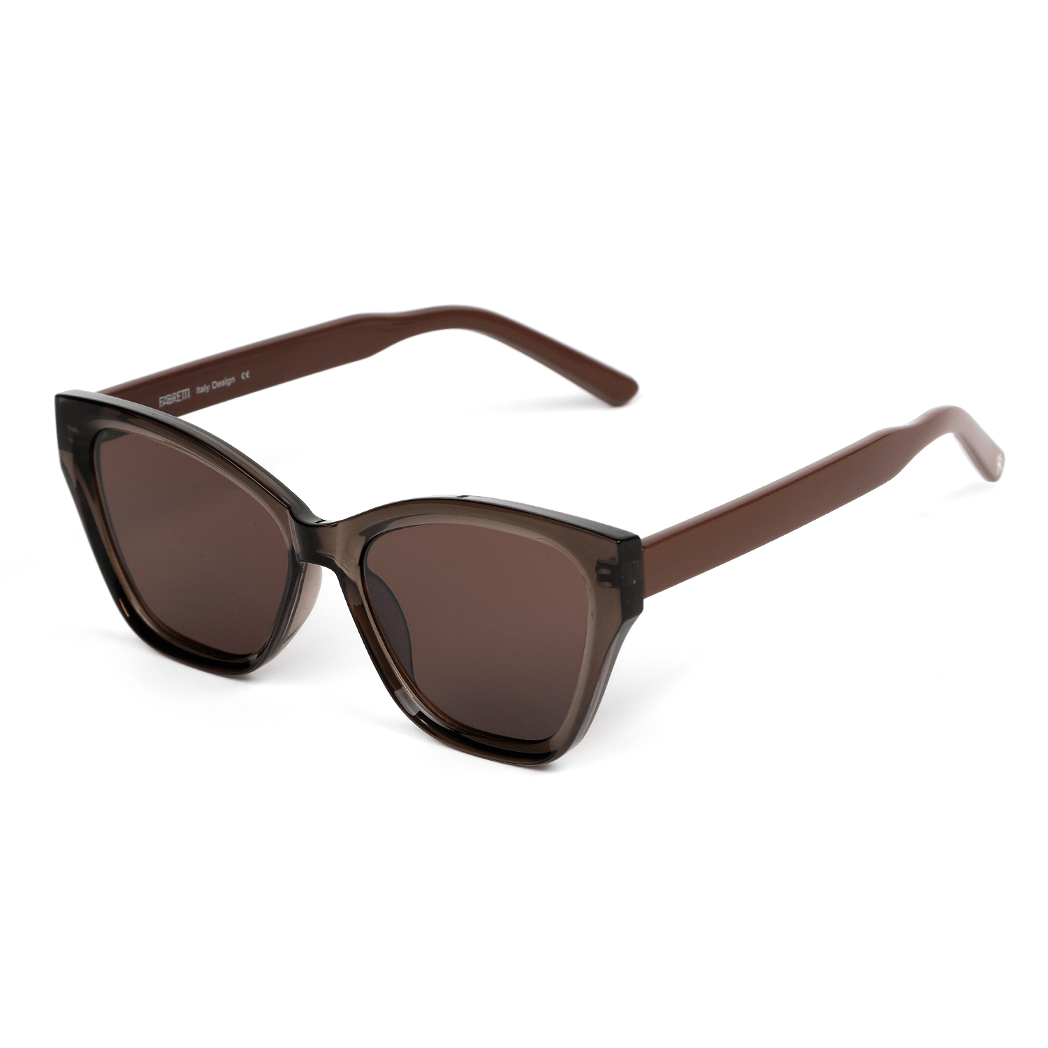 Элегантные солнцезащитные очки итальянского бренда FABRETTI в полупрозрачной оправе кофейного оттенка в форме "кошачий глаз". Однотонные коричневые линзы позволяют видеть одинаково хорошо как в помещении, так и на солнечной улице.
