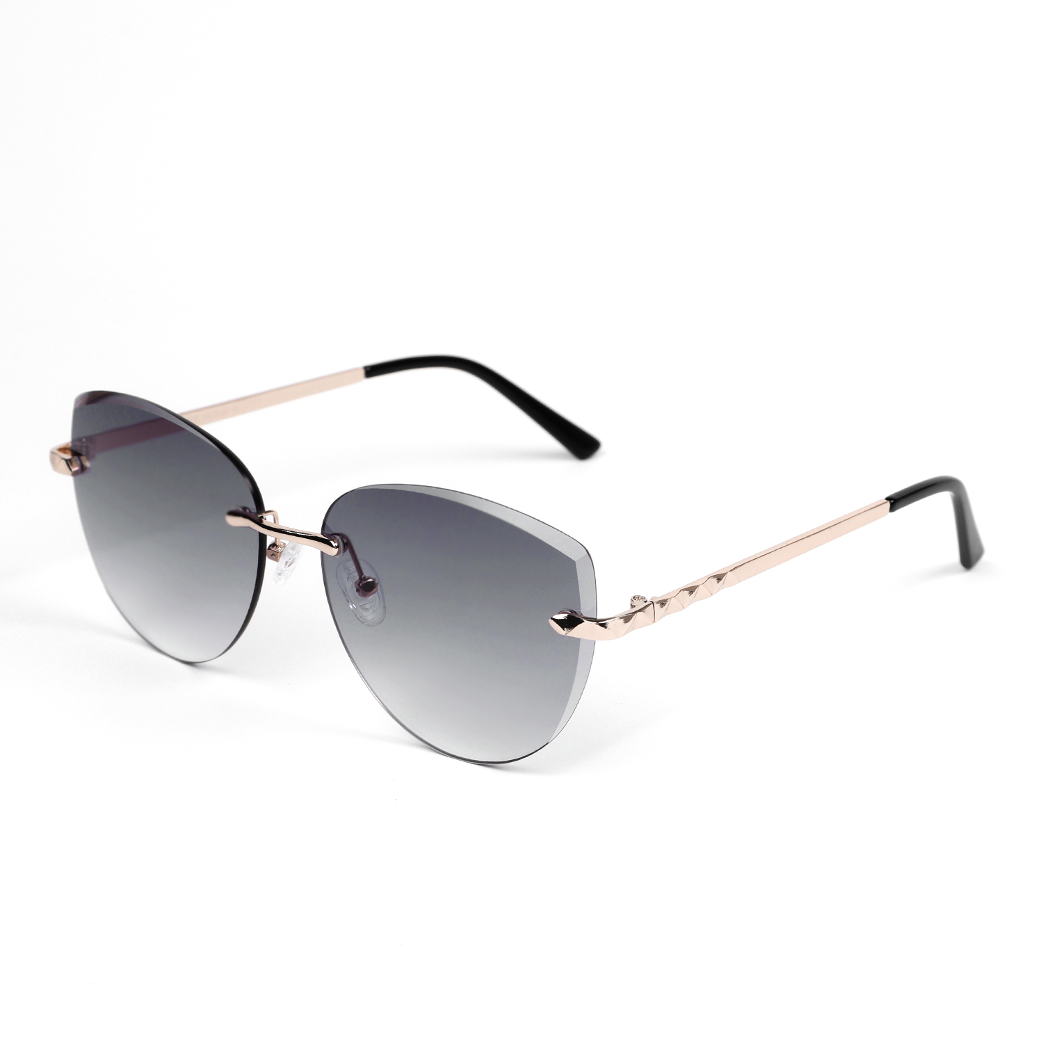 Солнцезащитные очки итальянского бренда FABRETTI в форме "кошачий глаз" без оправы, с золотистыми дужками и мостом. Градиентные серые линзы позволяют видеть одинаково хорошо как в помещении, так и на солнечной улице.