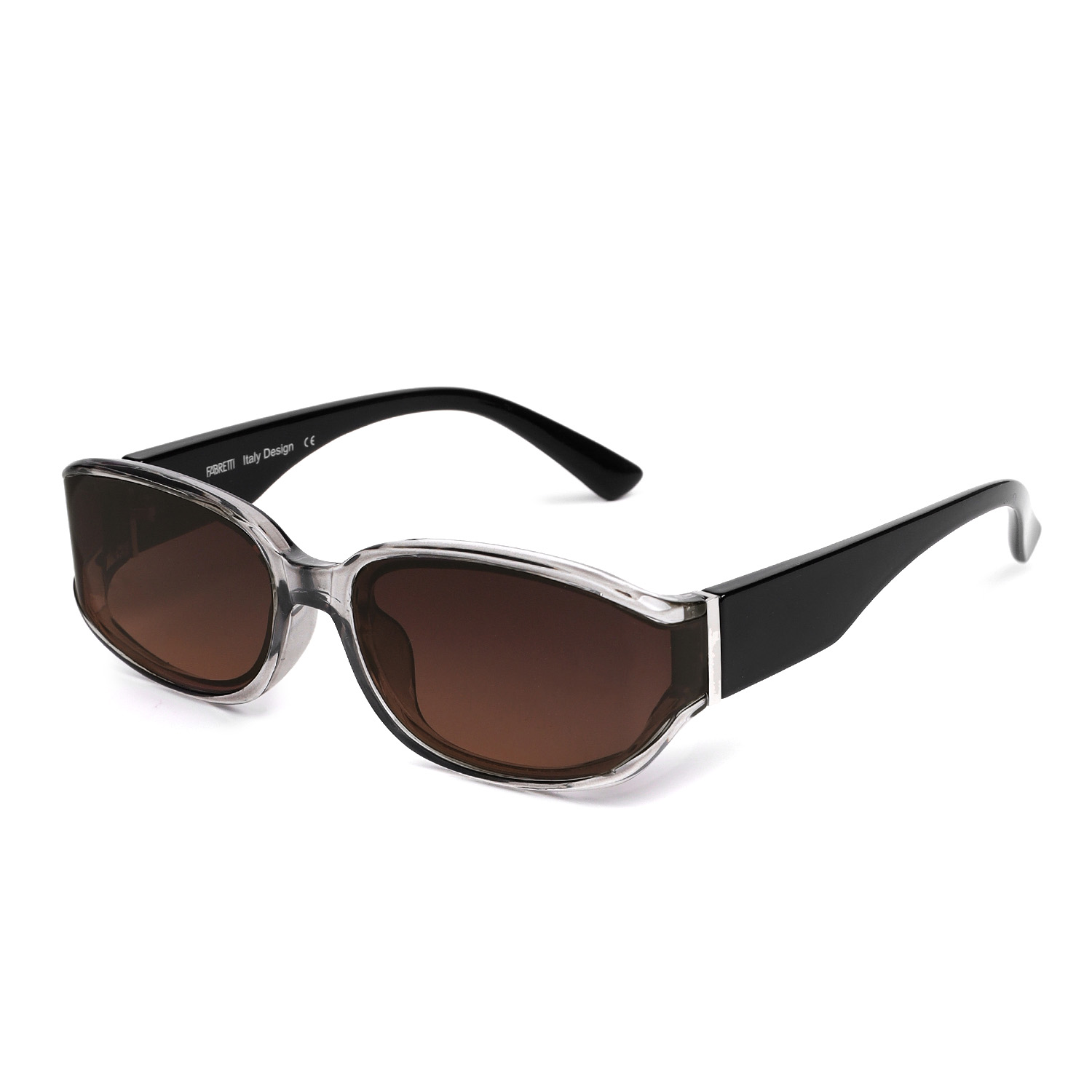 Современные солнцезащитные очки итальянского бренда FABRETTI в узкой прозрачной серой оправе. Градиентные линзы кофейного оттенка позволяют видеть одинаково хорошо как в помещении, так и на солнечной улице.