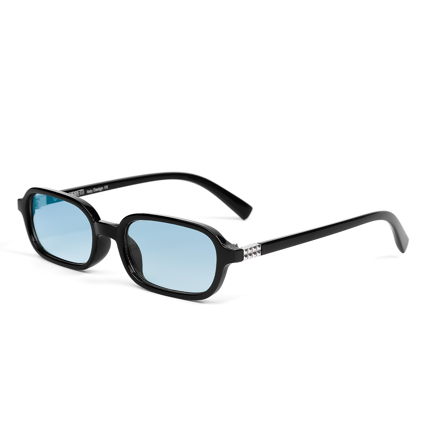 Современные солнцезащитные очки итальянского бренда FABRETTI в узкой черной оправе. Градиентные голубые линзы позволяют видеть одинаково хорошо как в помещении, так и на улице в пасмурную погоду или в сумерках