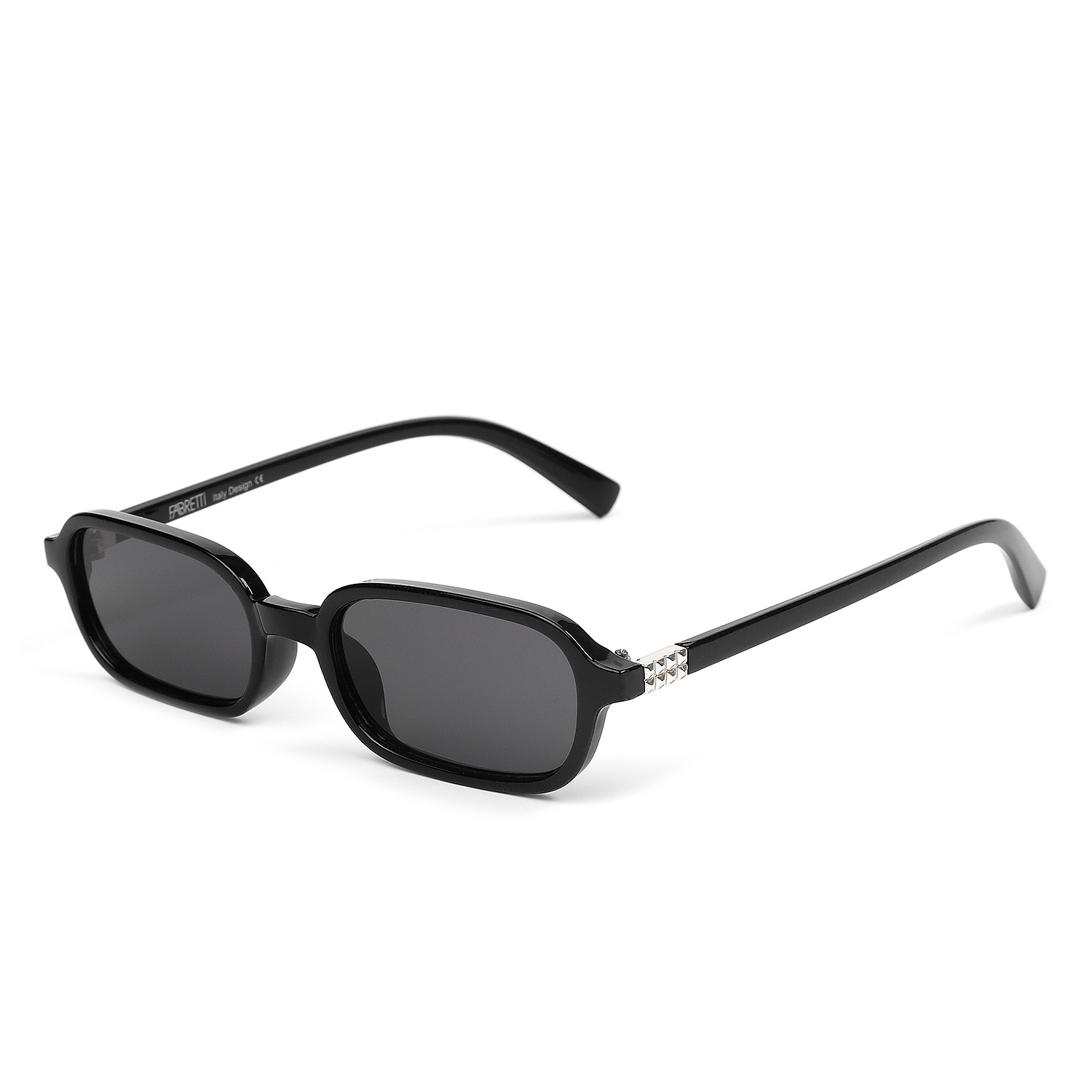 Современные солнцезащитные очки итальянского бренда FABRETTI в узкой черной оправе. Однотонные серые линзы позволяют видеть одинаково хорошо как в помещении, так и на солнечной улице.