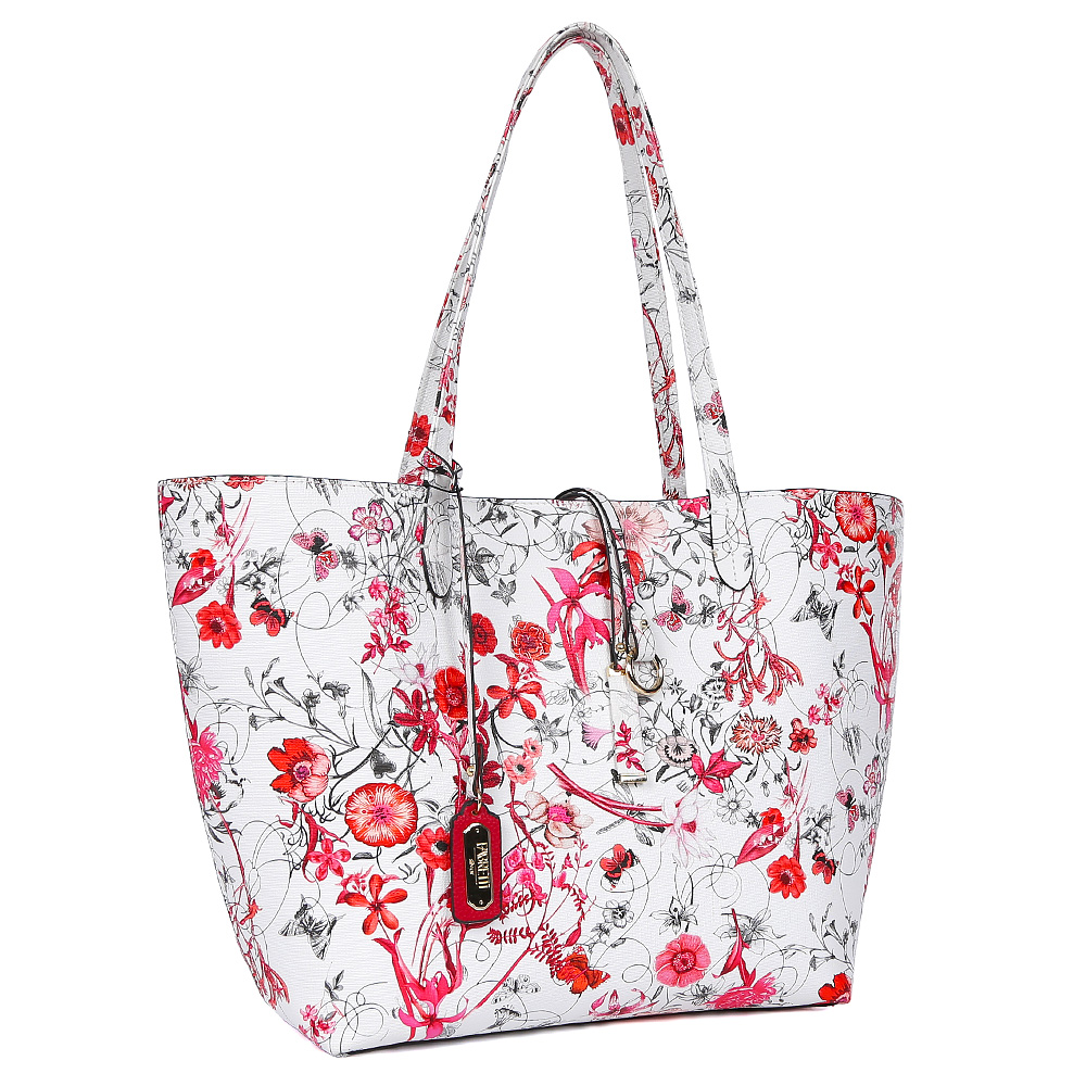 Утонченная сумка вместительной формы - один из самых популярных аксессуаров городского look-a на протяжении многих модных сезонов. Женская сумка Fabretti, выполненная из высококачественной экокожи, будет прекрасно смотреться с любым современным образом. Сочетание белых и красных оттенков и дизайнерский цветочный принт - все это подчеркнет утончённый и ультрамодный вкус своей обладательницы. Уникальность сумки заключается в съемном внутреннем отделении, с помощью которого вы можете регулировать вместительность аксессуара, а также трансформировать сумку в кросс-боди. Внутри сумки можно с легкостью расположить сотовый телефон и другие женские мелочи с помощью трех удобных карманов, один из которых закрывается на прочную молнию. Вместительный размер изделия позволит вам носить с собой папки и документы формата А4, ежедневники, а также любимые гаджеты.
