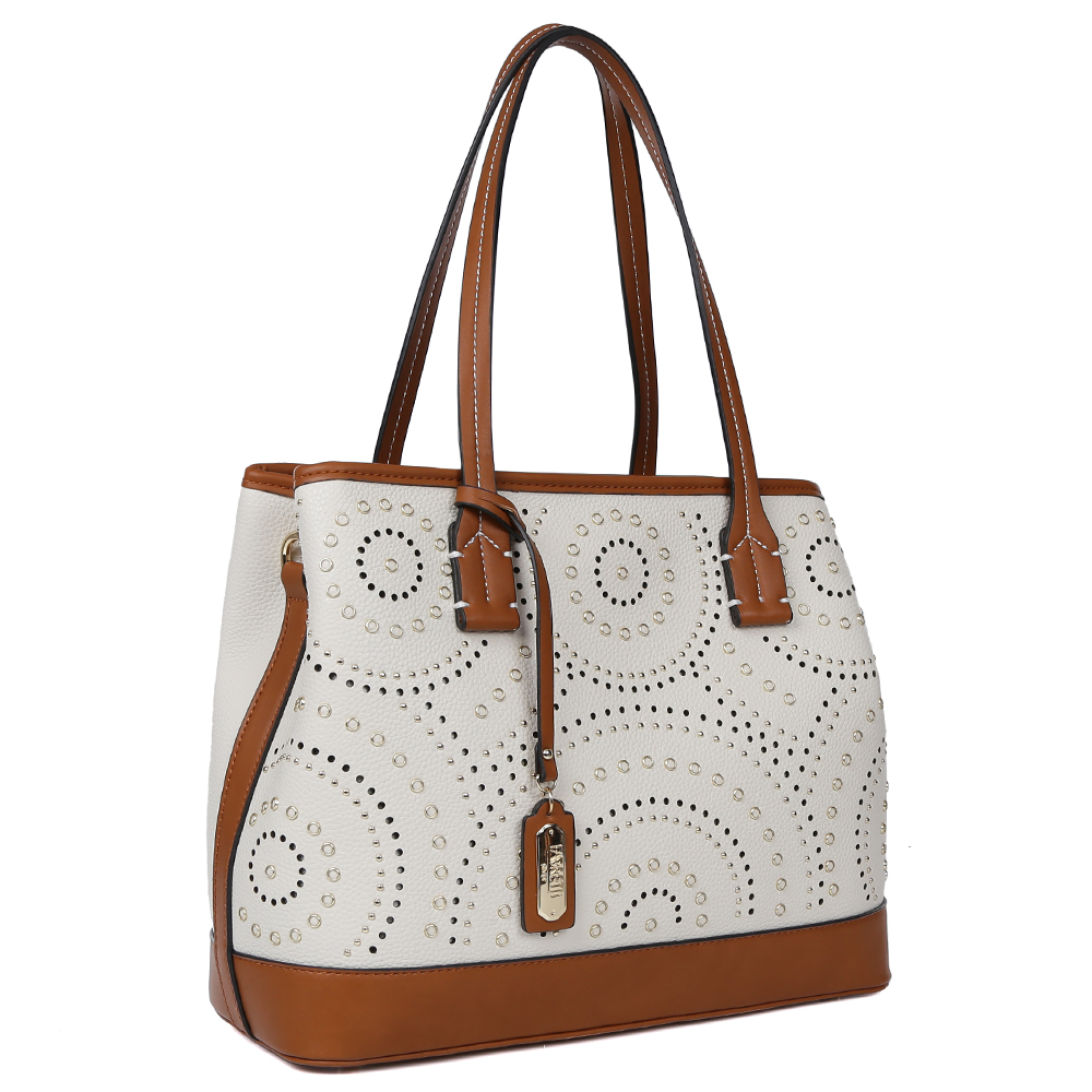 Элегантная женская сумка Fabretti выполнена из высококачественной экокожи, которая держит форму и имеет невероятную мягкость и гладкость фактуры. Если вы любите роскошный, но не вычурный стиль, эта модель создана специально для вас. Элегантное сочетание коричневого и бежевого оттенка, а также дизайнерская отделка люверсами - все это придаст любому образу нотки элегантности и итальянского шика. Сумка имеет одно вместительное отделение, которое разделяется отсеком на два вместительных отдела. Внутри аксессуара вы расположите свой сотовый телефон и другие женские мелочи за счет удобных карманов. На тыльной стороне дизайнеры разместили вместительный карман, который закрывается на стильную молнию. В комплекте аксессуар имеет длинный ремень, с помощью которого, вы сможете трансформировать сумку Fabretti в кросс-боди и стать самой неотразимой как на любой деловой встрече, так и в кампании друзей