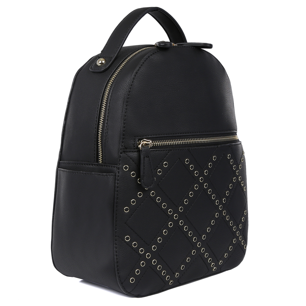 Женский рюкзак из новой линии Fabretti Silver, выполненнsq из высококачественной экокожи, воплотил в себе все элементы моднейшего стиля "спортивный шик". Классический черный оттенок и дизайнерская россыпь люверсов и ультрамодная форма - все это продемонстрирует окружающим ваше умение выбирать самые актуальные и модные аксессуары. Рюкзак отлично подойдет не только к рваным джинсам, но и добавит нотки игривости в сдержанный образ. Внутри аксессуара находится одно отделение, которое закрывается на прочную молнию. Вы сможете разместить сотовый телефон, а также мелкие вещи с помощью внутренних карманов. На лицевой части рюкзака дизайнеры разместили удобное отделение с длинным поводком, чтобы самые нужные вещи всегда были под рукой. Рюкзак компактен и не вмещает документы формата А4.