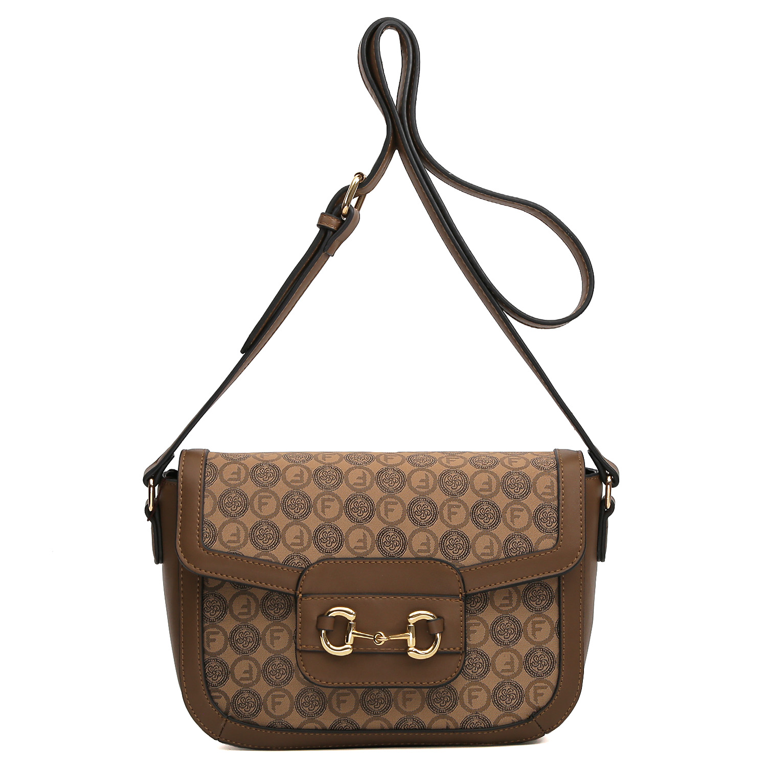 Стильная женская сумка кросс-боди итальянского бренда Fabretti отлчается выразительным дизайном в ультрамодном стиле "логомания". Благородный коричневый цвет придает аксессуару оттенок аристократизма. Сумка имеет одно внутреннее отделение, которое закрывается на клапан с эффектной фурнитурой и с магнитным замком, а также дополнительной молнией. Внутри расположены 2 кармана для мелочей. Длина плечевого ремня регулируется.
