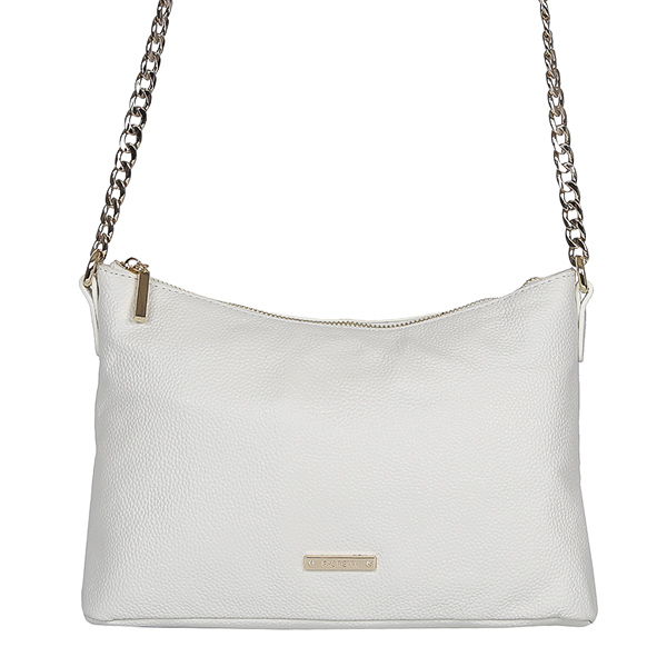 Женская сумка Fabretti белого цвета из натуральной кожи. Внутри: два отделения, в которых находится боковой карман на молнии и два кармана для мелочей .Фурнитура - блестящее золото.Сумка закрывается на металлическую молнию. Кожа средней плотности, форму держит. Размеры меньше формата А4.Длина наплечного ремня регулируется.