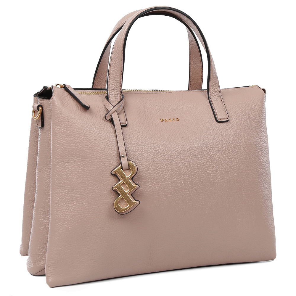 Элегантную сумку с короткими ручками бренда PALIO по достоинству оценят деловые женщины, привыкшие все держать в порядке и под рукой. Модель вместительна и вместе с тем компактна, формат А4 немного ей не подходит. Сумку удобно носить в руке, а благодаря съемному регулируемому ремню - на плече. С таким аксессуаром женщина всегда сможет иметь при себе все необходимое, при этом она будет выглядеть строго и со вкусом. Оригинальный брелок придает модели особый шик и привносит в дизайн элемент кокетства. Этому же способствует и нежный цвет модели. Сумка выполнена из крупнозернистой кожи, на тыльной стороне расположен карман на молнии. Основное отделение также закрывается на молнию. Внутри сумки находятся три отсека и три внутренних кармана для мелочей.