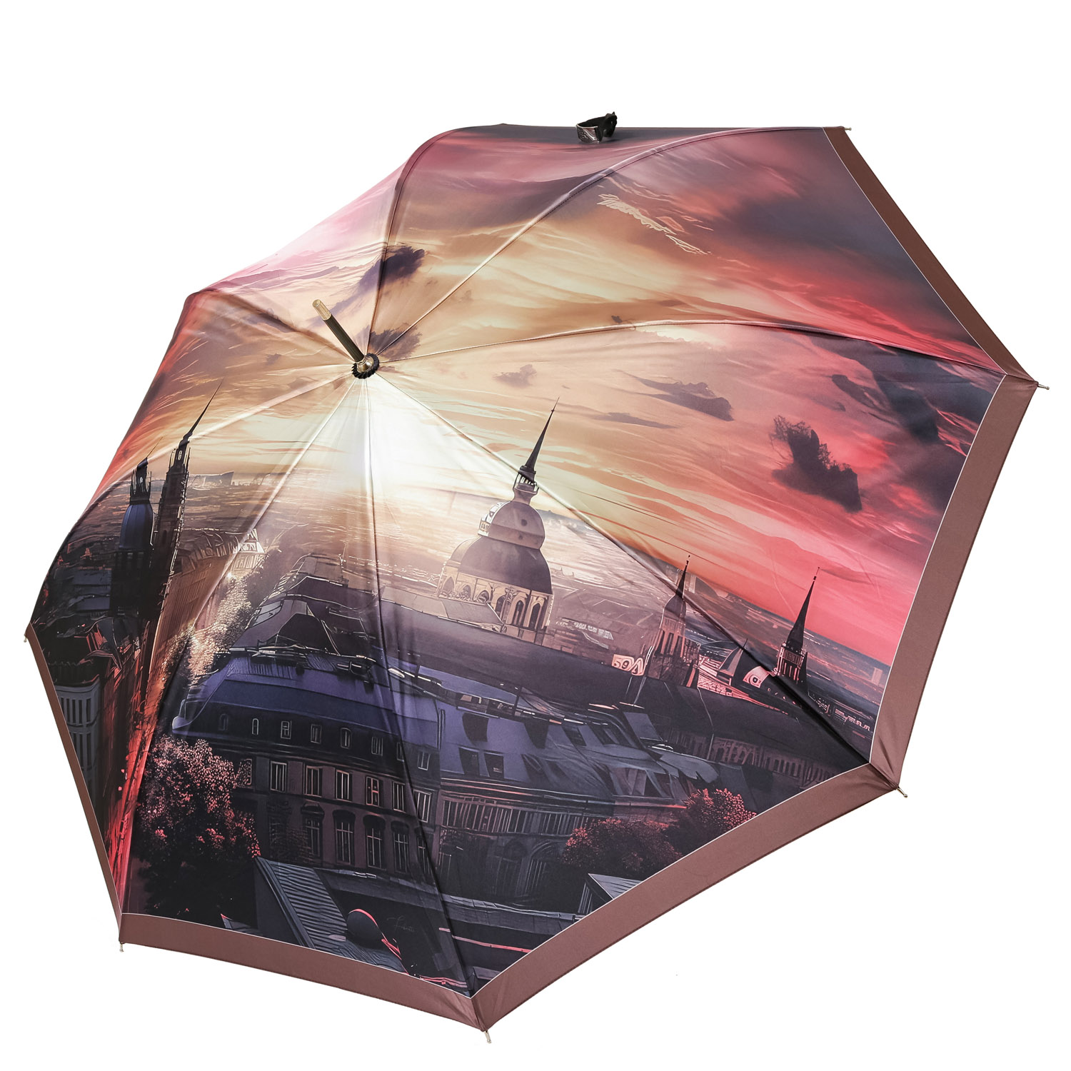 Купол зонта-трости FABRETTI в розовой гамме декорирован дизайнерским принтом. Рисунок нанесен с помощью панорамной техники цифровой печати, которая обеспечивает долговечность изображению и точность цветопередачи. Купол выполнен из прочного водоотталкивающего полиэстера (сатин) и обладает гладкой шелковистой текстурой. Вода, попадая на такой купол, превращается в капли и легко скатываться вниз.