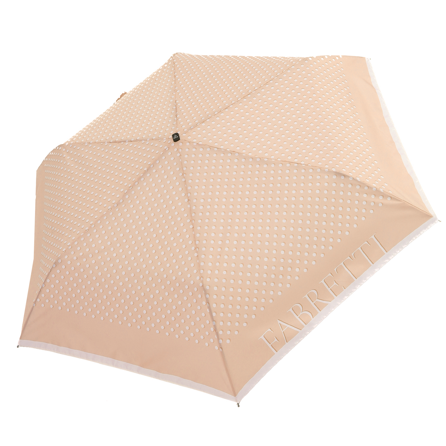 Удобный женский зонт-автомат с плоской ручкой итальянского бренда FABRETTI с куполом светло-бежевого цвета, украшенным классическим узором в горошек.