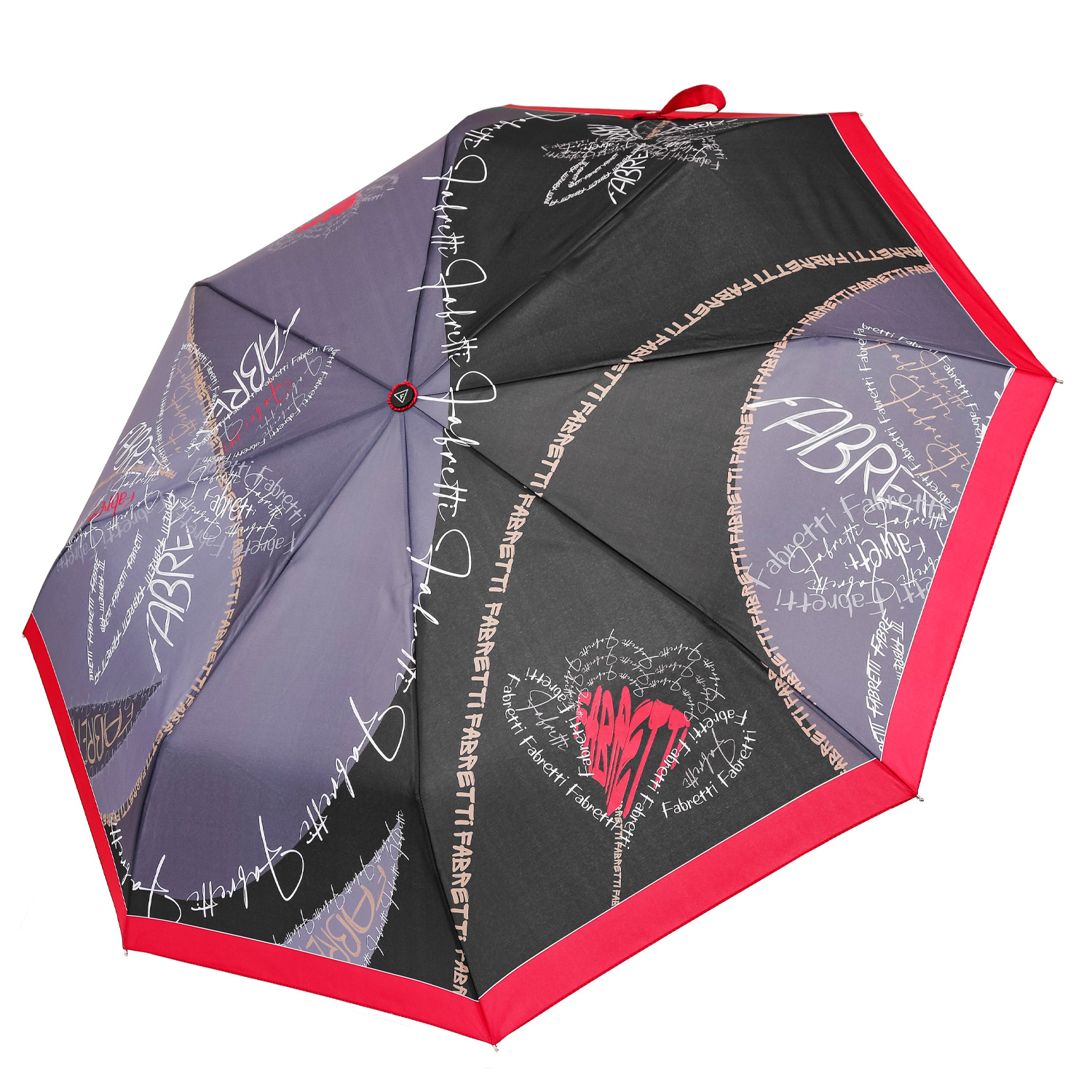 Купол зонта-автомата FABRETTI сочетает черный и серый оттенки и украшен дизайнерским принтом в стиле "Логомания". Края декорированы контрастным малиновым кантом. Рисунок нанесен с помощью техники цифровой печати, которая обеспечивает долговечность изображению и точность цветопередачи. Купол выполнен из полиэстера с плетением нити - эпонж. Такое плетение помимо матовой фактуры придает ткани высокую прочность и устойчивость к выцветанию. Вода, попадая на такой купол, превращается в капли и легко скатываться вниз.
