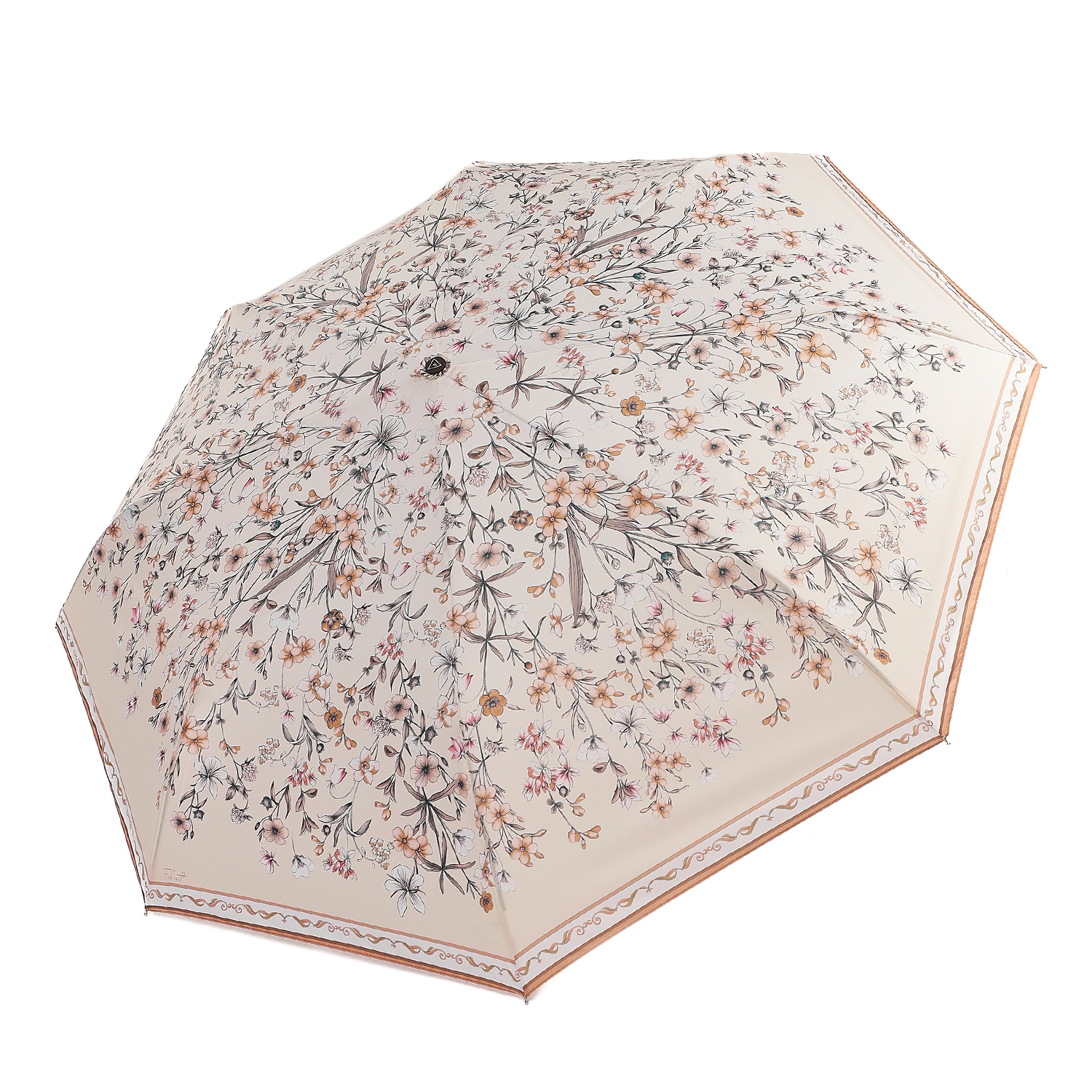 Небольшой женский зонт-автомат итальянского бренда FABRETTI с куполом, украшенным узором из полевых цветов на нежном бежевом фоне.