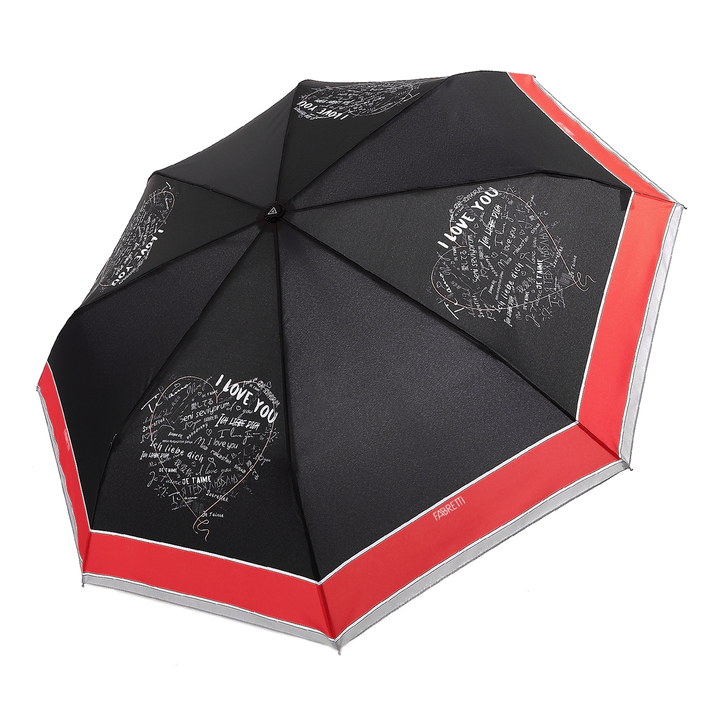 Небольшой женский зонт-автомат итальянского бренда FABRETTI черного цвета с романтическими надписями на разных языках, формирующими сердце, цветовой акцент – красный. Купол выполнен из материала с матовой фактурой эпонж. Она придает ткани высокую прочность и устойчивость к выцветанию. Вода, попадая на такой купол, превращается в капли и легко скатываться вниз.