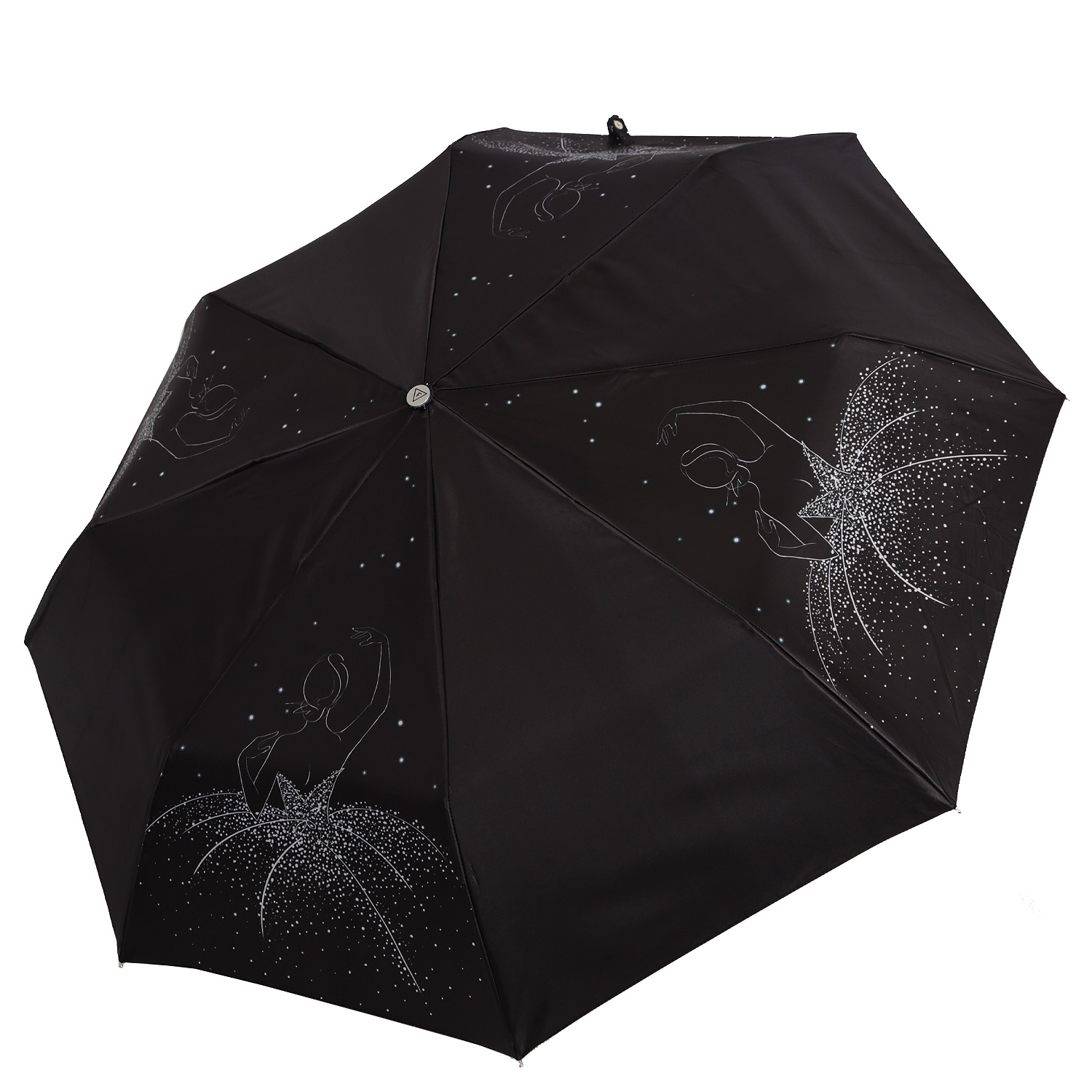 Для создания купола зонта-автомата FABRETTI использовали прочный полиэстер с приятной гладкой фактурой и сатиновым блеском. Вода, попадая на такой купол, превращается в капли и легко скатываться вниз. Однотонные клинья черного цвета чередуются с изящными очертаниями танцующей балерины.
