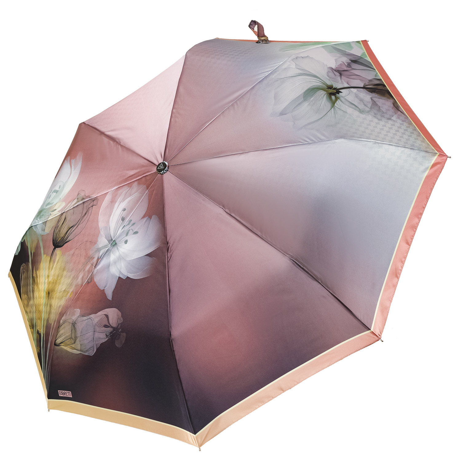 Купол зонта-автомата FABRETTI в шоколадном оттенке украшен дизайнерским принтом с изображением цветов и по краям декорирован коричневым кантом. Рисунок нанесен с помощью техники цифровой печати, которая обеспечивает долговечность изображению и точность цветопередачи. Купол выполнен из полиэстера с приятной гладкой фактурой и сатиновым блеском. Вода, попадая на такой купол, превращается в капли и легко скатываться вниз.