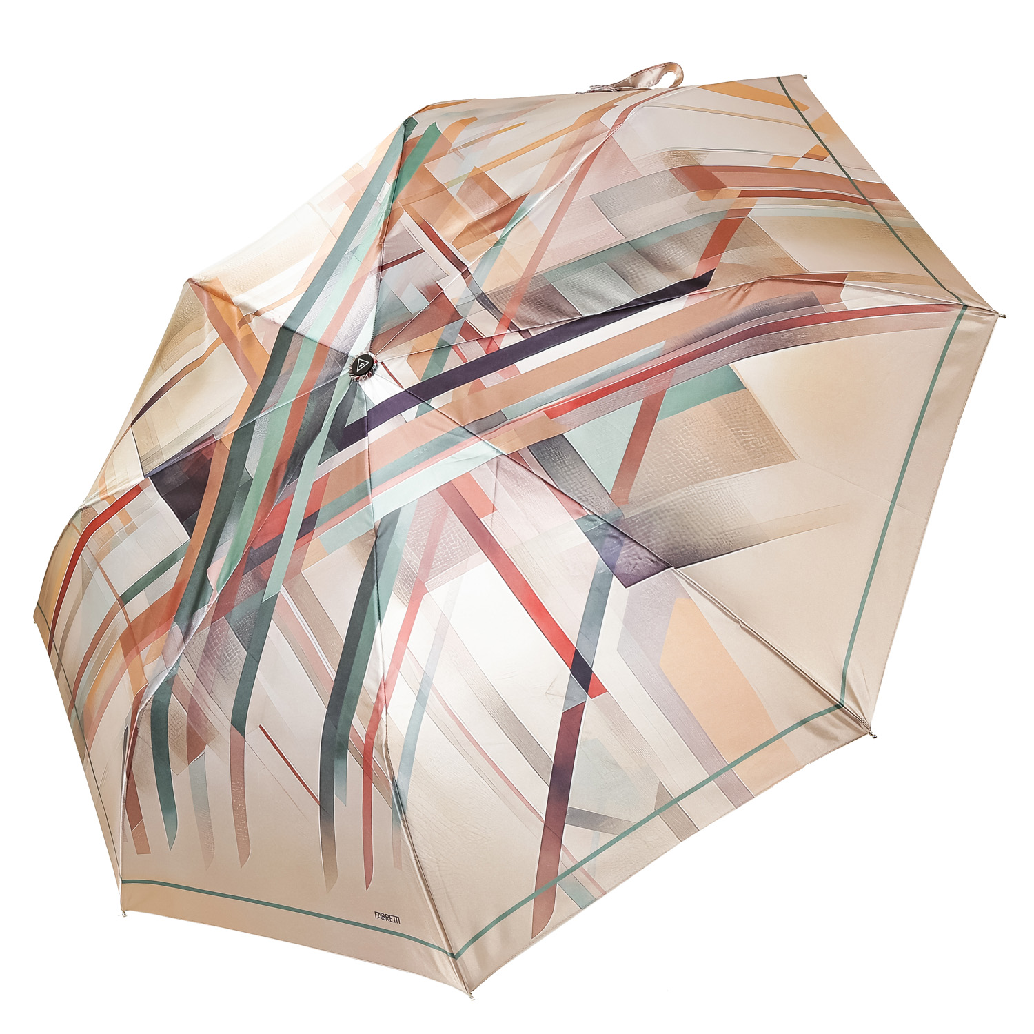 Купол зонта-автомата FABRETTI в бежевом оттенке украшен абстрактным дизайнерским принтом. Рисунок нанесен с помощью техники цифровой печати, которая обеспечивает долговечность изображению и точность цветопередачи. Купол выполнен из полиэстера с приятной гладкой фактурой и сатиновым блеском. Вода, попадая на такой купол, превращается в капли и легко скатываться вниз.
