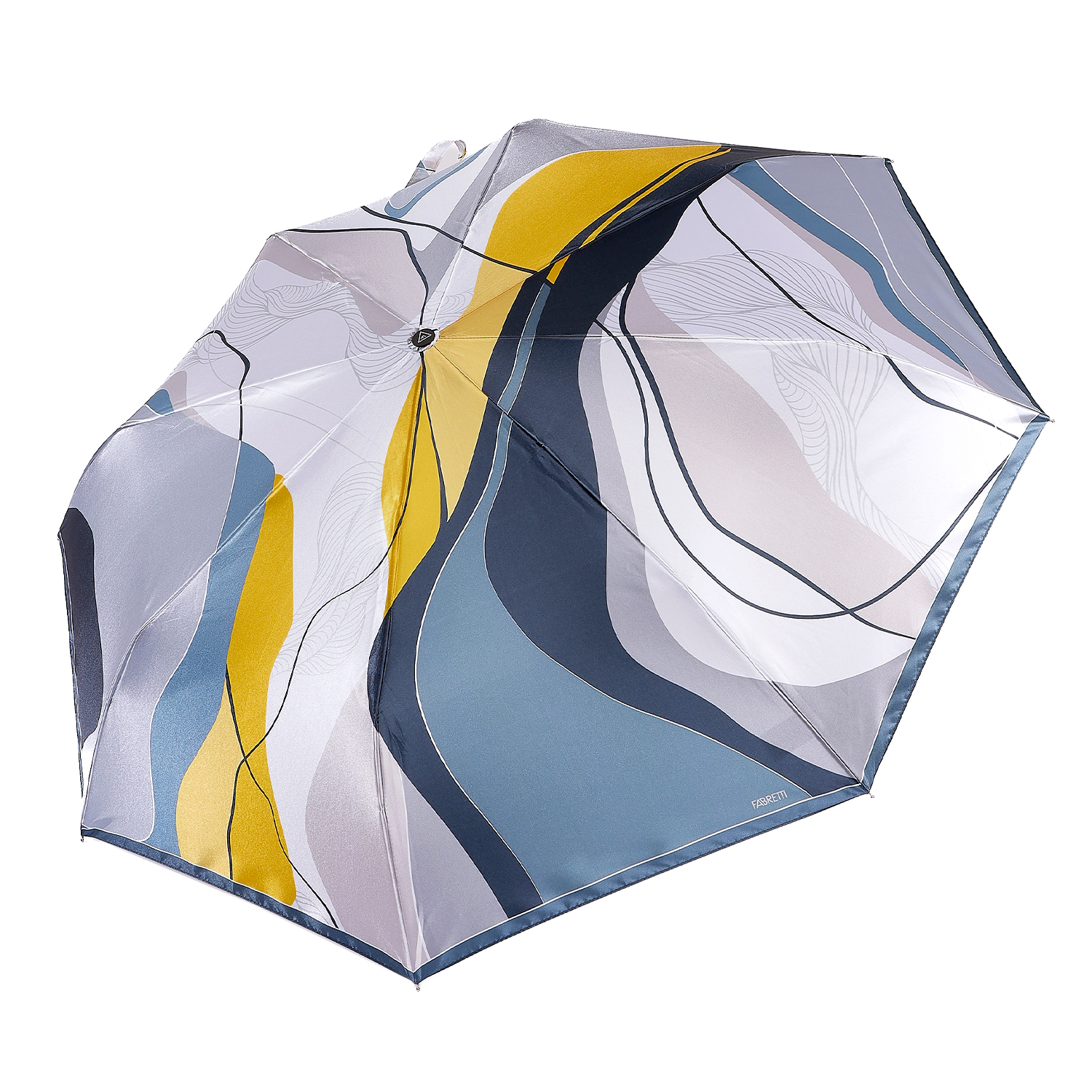 Зонт-автомат тройного сложения итальянского бренда FABRETTI со сложным абстрактным узором, разводами, линиями и полосками в оттенках серо-голубого и желтого. Купол выполнен из гладкого искусственного сатина с шелковистой фактурой и мягким блеском.