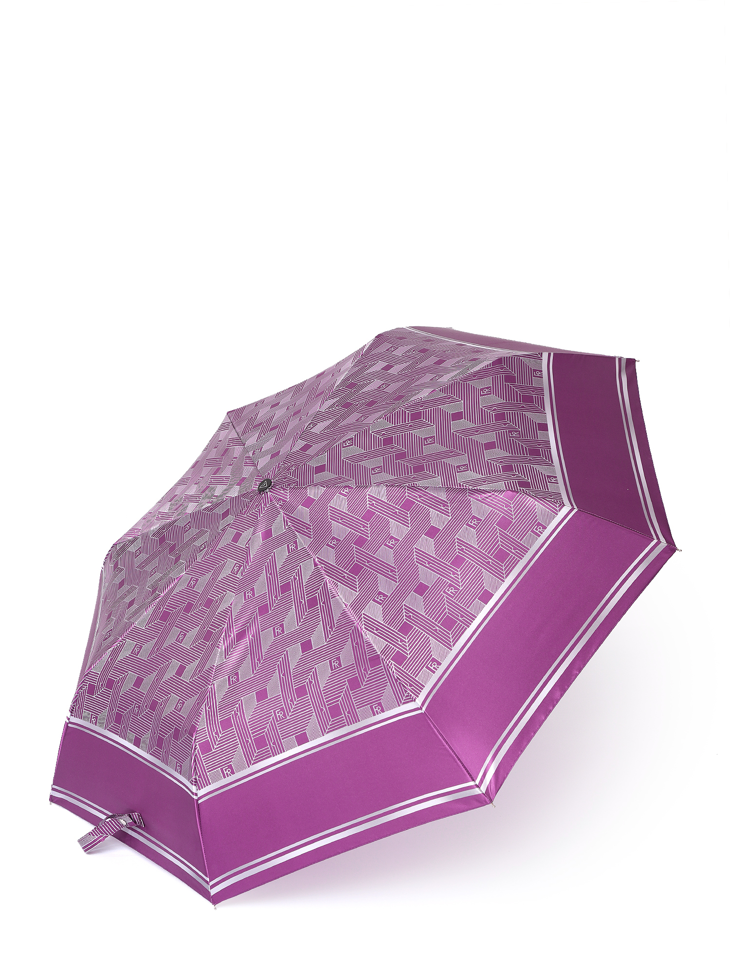 Зонт-автомат тройного сложения итальянского бренда FABRETTI украшен сложным геометрическим узором светло-серого цвета на благородном пурпурно-фиолетовом фоне. Купол выполнен из гладкого искусственного сатина с шелковистой фактурой и мягким блеском.