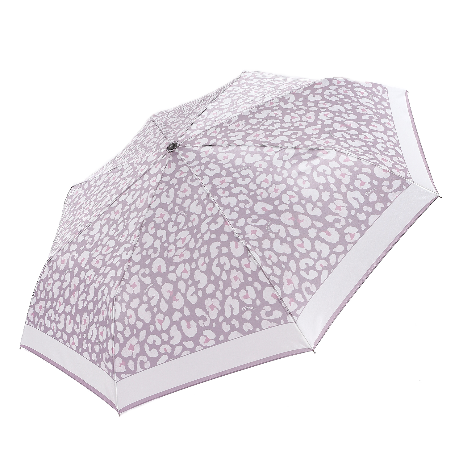 Зонт-автомат тройного сложения итальянского бренда FABRETTI с куполом розово-коричневого цвета, украшенным абстрактным принтом, напоминающим леопардовый узор. Купол выполнен из гладкого искусственного сатина с шелковистой фактурой и мягким блеском.