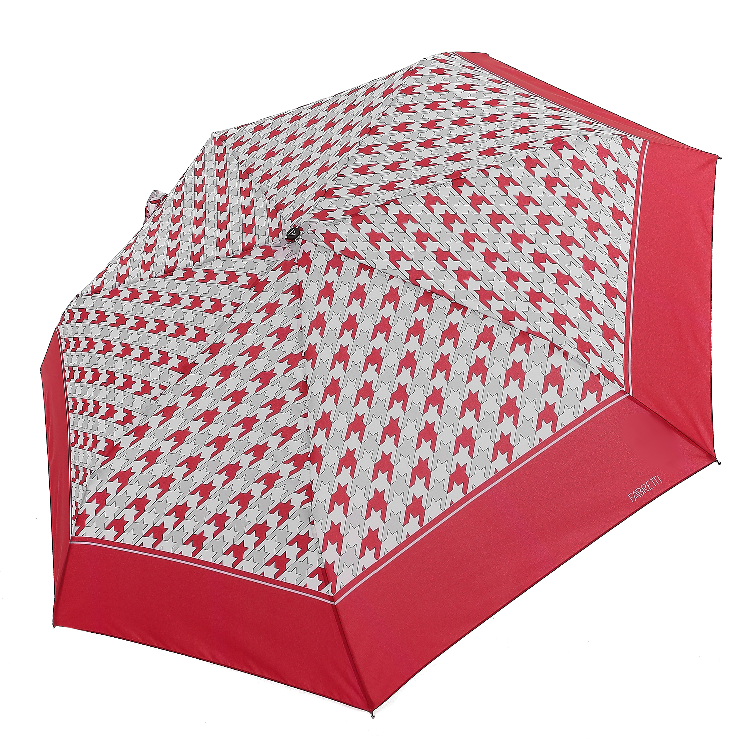 Компактный зонт итальянского бренда FABRETTI легко поместится в сумку и всегда будет под рукой в нужный момент. Купол с классическим узором «гусиная лапка» красного, белого и серого цветов выполнен из материала с матовой фактурой эпонж. Она придает ткани высокую прочность и устойчивость к выцветанию.