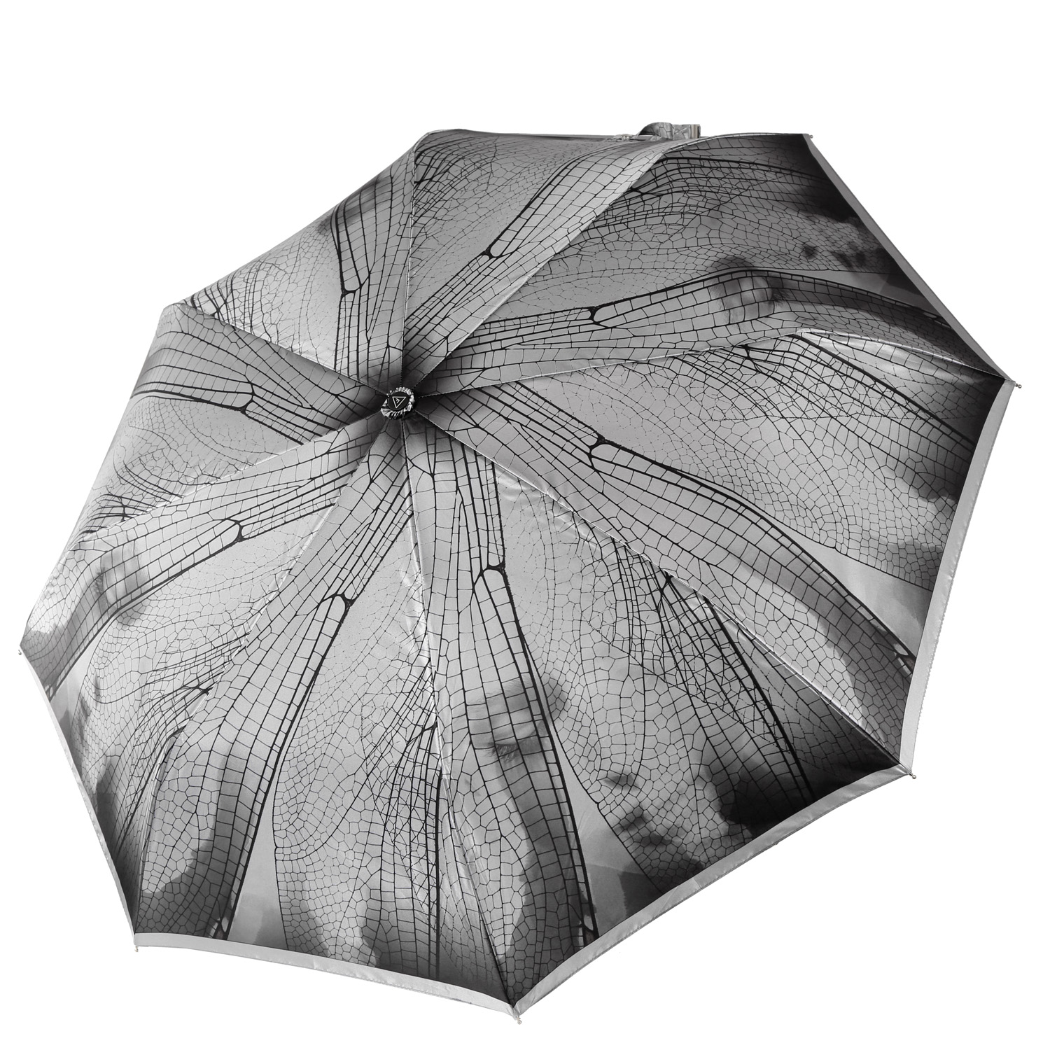 Купол стильного зонта-автомата FABRETTI в серых металлических оттенках выполнен из полиэстера с приятной гладкой фактурой и сатиновым блеском. Вода, попадая на такой купол, превращается в капли и легко скатываться вниз. Украшением служит эффектный дизайнерский принт-иллюзия "Крыло стрекозы". Дополняет дизайн узкий кант в жемчужно-сером оттенке.