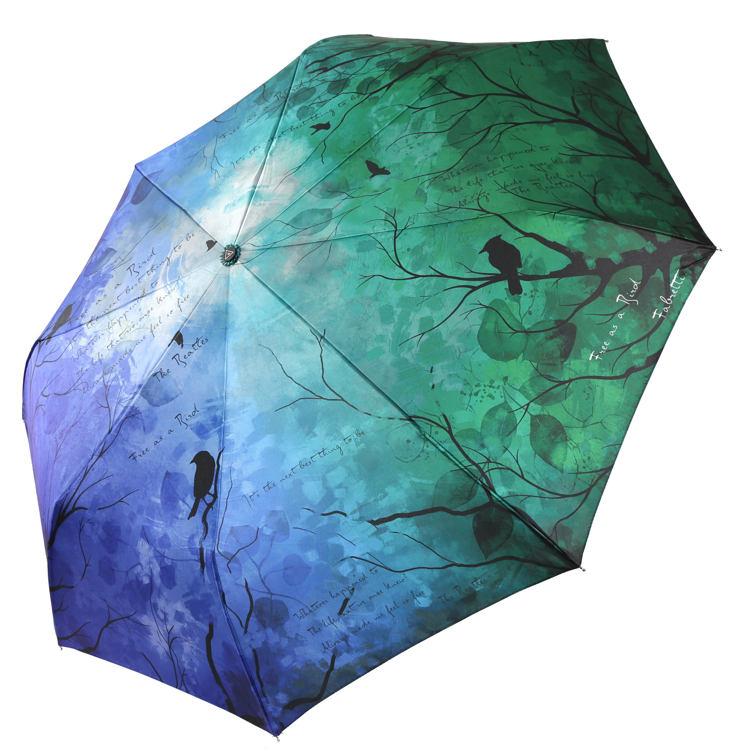 Купол зонта-автомата FABRETTI в зелено-синей гамме украшен эффектным дизайнерским принтом. Рисунок нанесен с помощью техники цифровой печати, которая обеспечивает долговечность изображению и точность цветопередачи. Купол выполнен из полиэстера с приятной гладкой фактурой и сатиновым блеском. Вода, попадая на такой купол, превращается в капли и легко скатываться вниз.