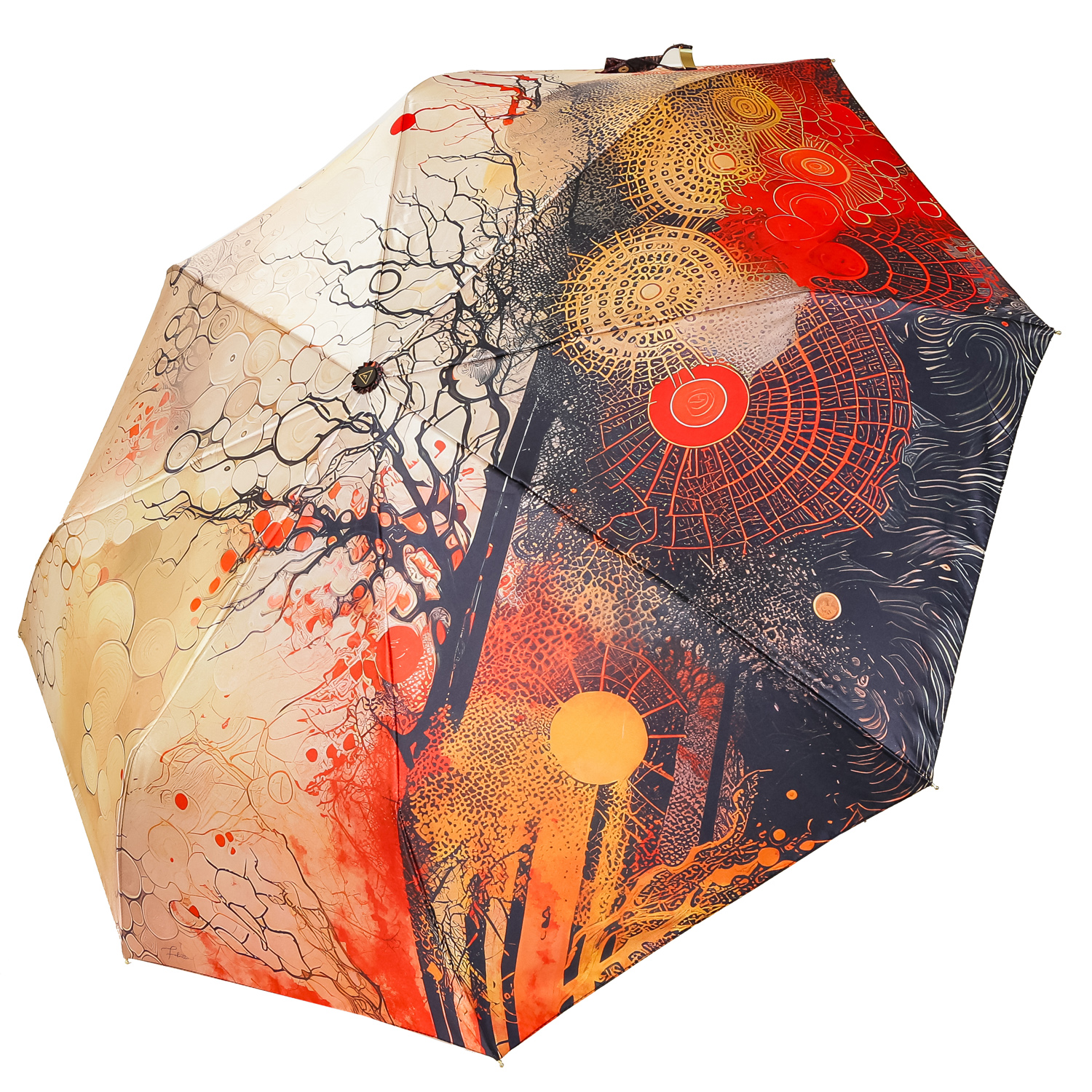 Купол зонта-автомата FABRETTI в оранжево-красной гамме декорирован эффектным дизайнерским принтом. Рисунок нанесен с помощью техники цифровой печати, которая обеспечивает долговечность изображению и точность цветопередачи. Купол выполнен из полиэстера с приятной гладкой фактурой и сатиновым блеском. Вода, попадая на такой купол, превращается в капли и легко скатываться вниз.
