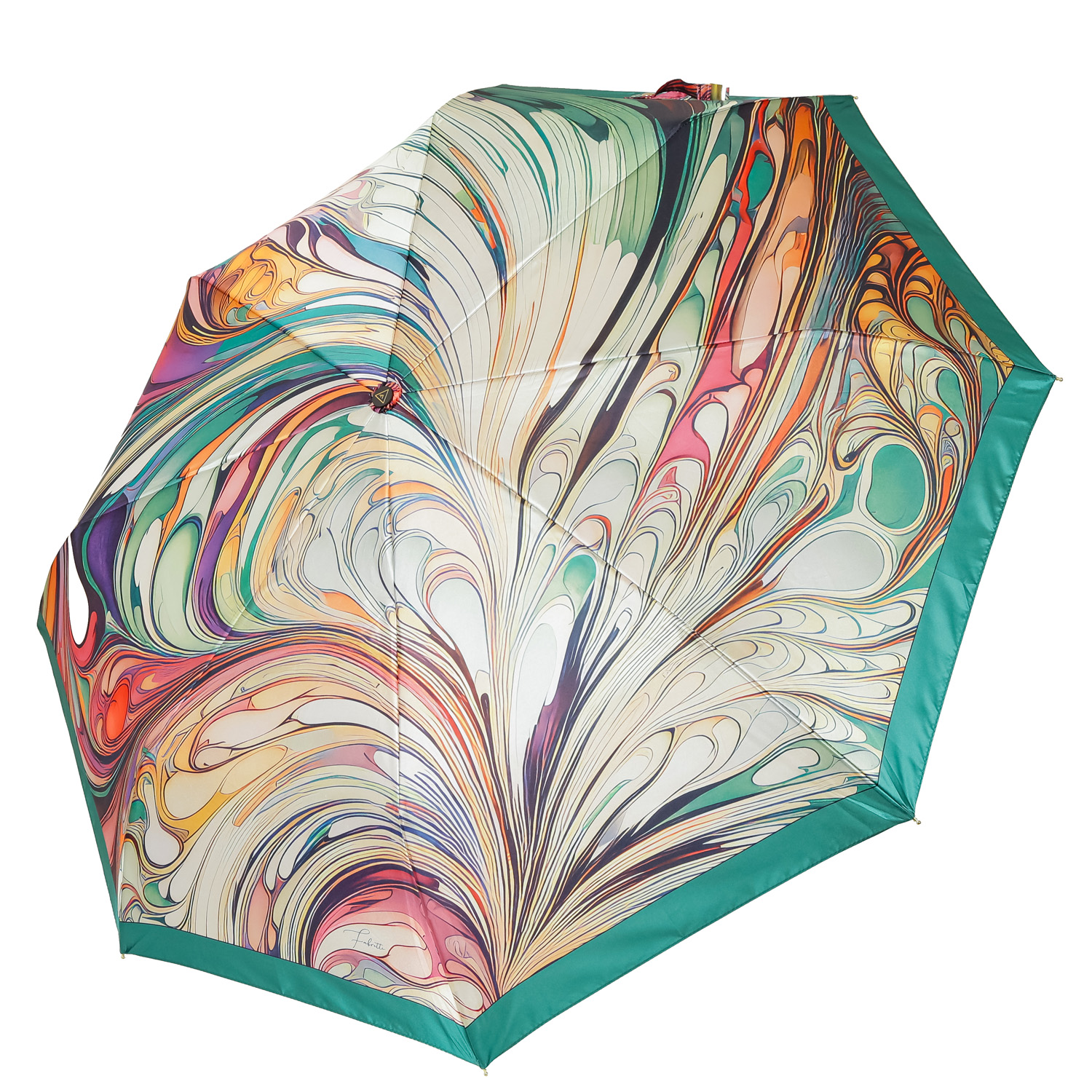 Купол зонта-автомата FABRETTI декорирован абстрактным дизайнерским принтом в желто-зеленой гамме. Рисунок нанесен с помощью техники цифровой печати, которая обеспечивает долговечность изображению и точность цветопередачи. Купол выполнен из полиэстера с приятной гладкой фактурой и сатиновым блеском. Вода, попадая на такой купол, превращается в капли и легко скатываться вниз.