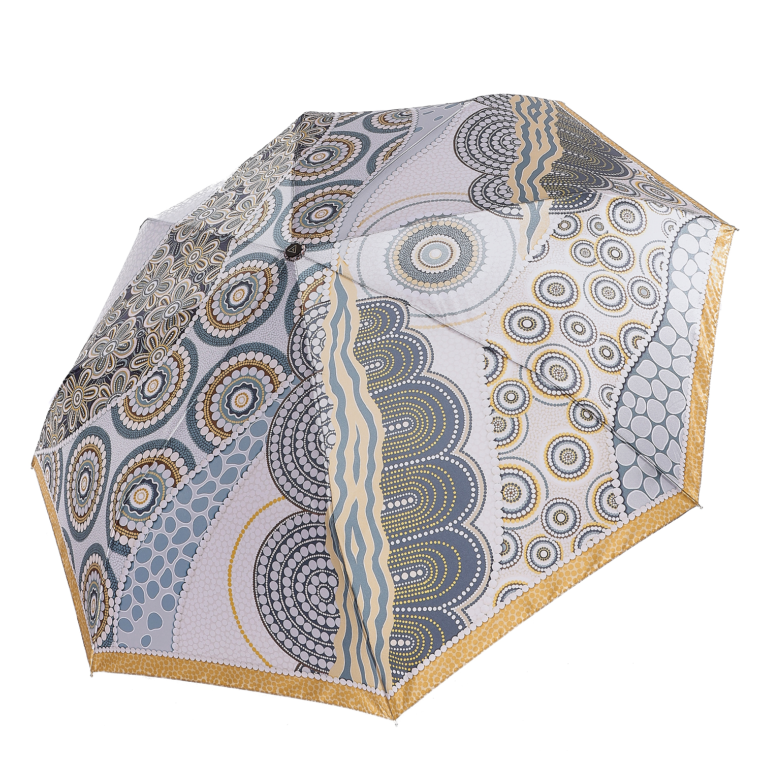 Зонт-автомат тройного сложения итальянского бренда FABRETTI с интересным абстрактным узором, сложенным из горошин разного размера, цвета и формы в серо-голубых и золотисто-бежевых тонах. Купол выполнен из гладкого искусственного сатина с шелковистой фактурой и мягким блеском.