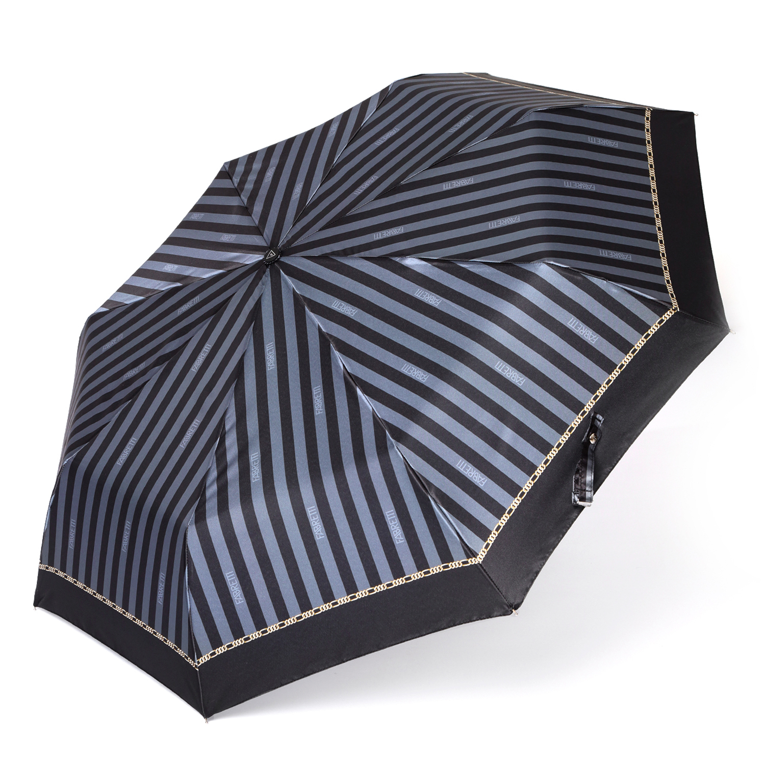 Зонт-автомат тройного сложения итальянского бренда FABRETTI украшен классическим узором в темно-серую и черную вертикальную полоску; акцентом выступает светло-желтый узор в виде цепочки с разными звеньями по краю купола. Купол выполнен из гладкого искусственного сатина с шелковистой фактурой и мягким блеском.