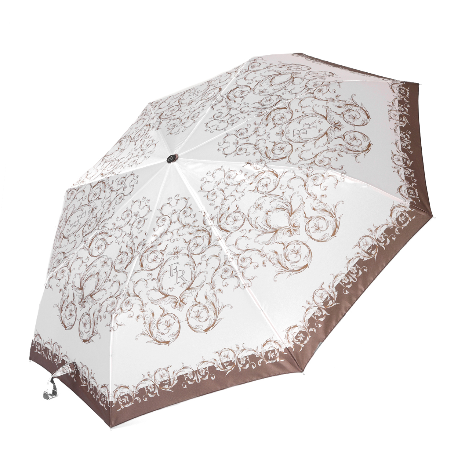 Зонт-автомат тройного сложения итальянского бренда FABRETTI в бежево-коричневой цветовой гамме украшен изящным орнаментом из вензелей с флоральными узорами. Купол выполнен из гладкого искусственного сатина с шелковистой фактурой и мягким блеском.