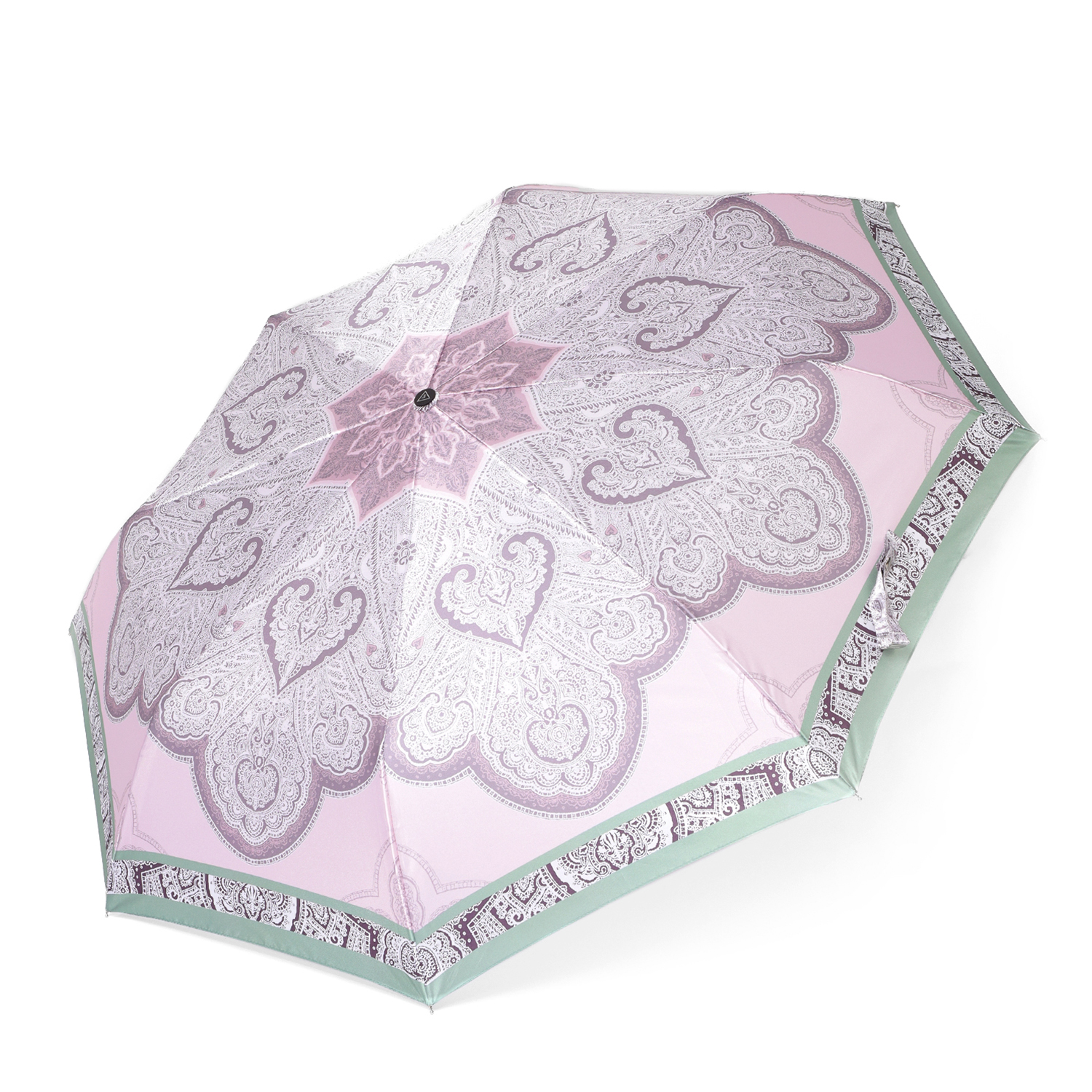 Зонт-автомат тройного сложения итальянского бренда FABRETTI в нежно-розовом цвете украшен романтичным кружевным восточным узором с пейсли и другими орнаментами, цветовым акцентом выступает контрасная пастельно-зеленая полоса по краю куполу. Купол выполнен из гладкого искусственного сатина с шелковистой фактурой и мягким блеском.