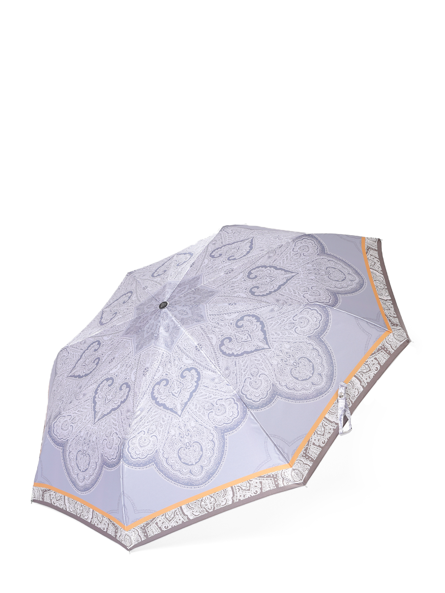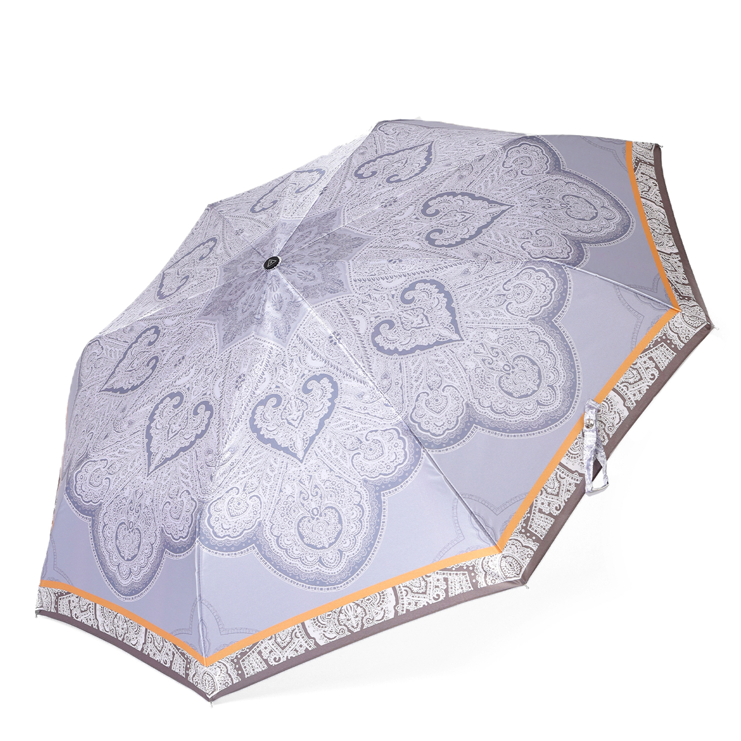 Зонт-автомат тройного сложения итальянского бренда FABRETTI в серо-голубом цвете украшен романтичным кружевным восточным узором с пейсли и другими орнаментами, цветовым акцентом выступает янтарно-желтая узкая полоса по краю куполу. Купол выполнен из гладкого искусственного сатина с шелковистой фактурой и мягким блеском.