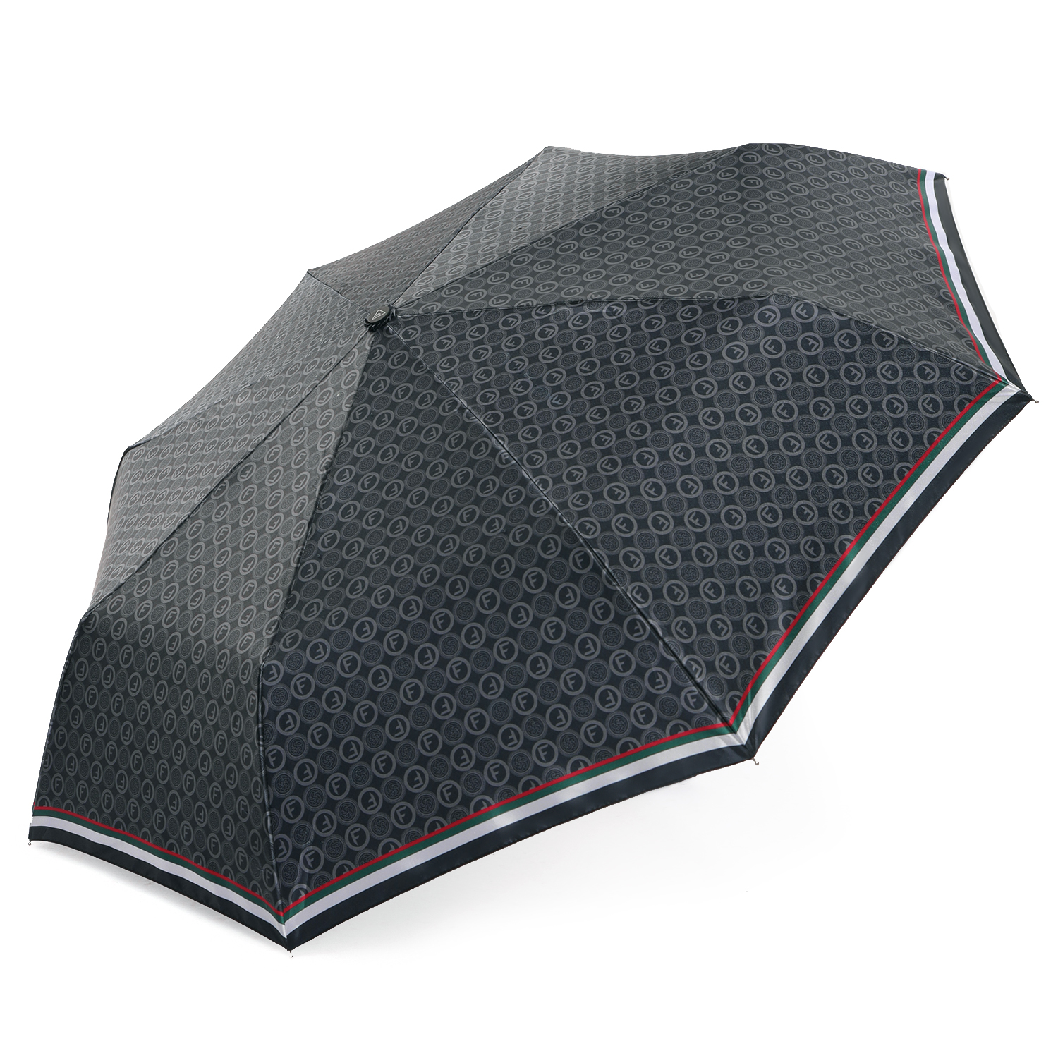 Зонт-автомат тройного сложения итальянского бренда FABRETTI украшен классическим узором в стиле «логомания» черного цвета с зеленым акцентом. Купол выполнен из гладкого искусственного сатина с шелковистой фактурой и мягким блеском.