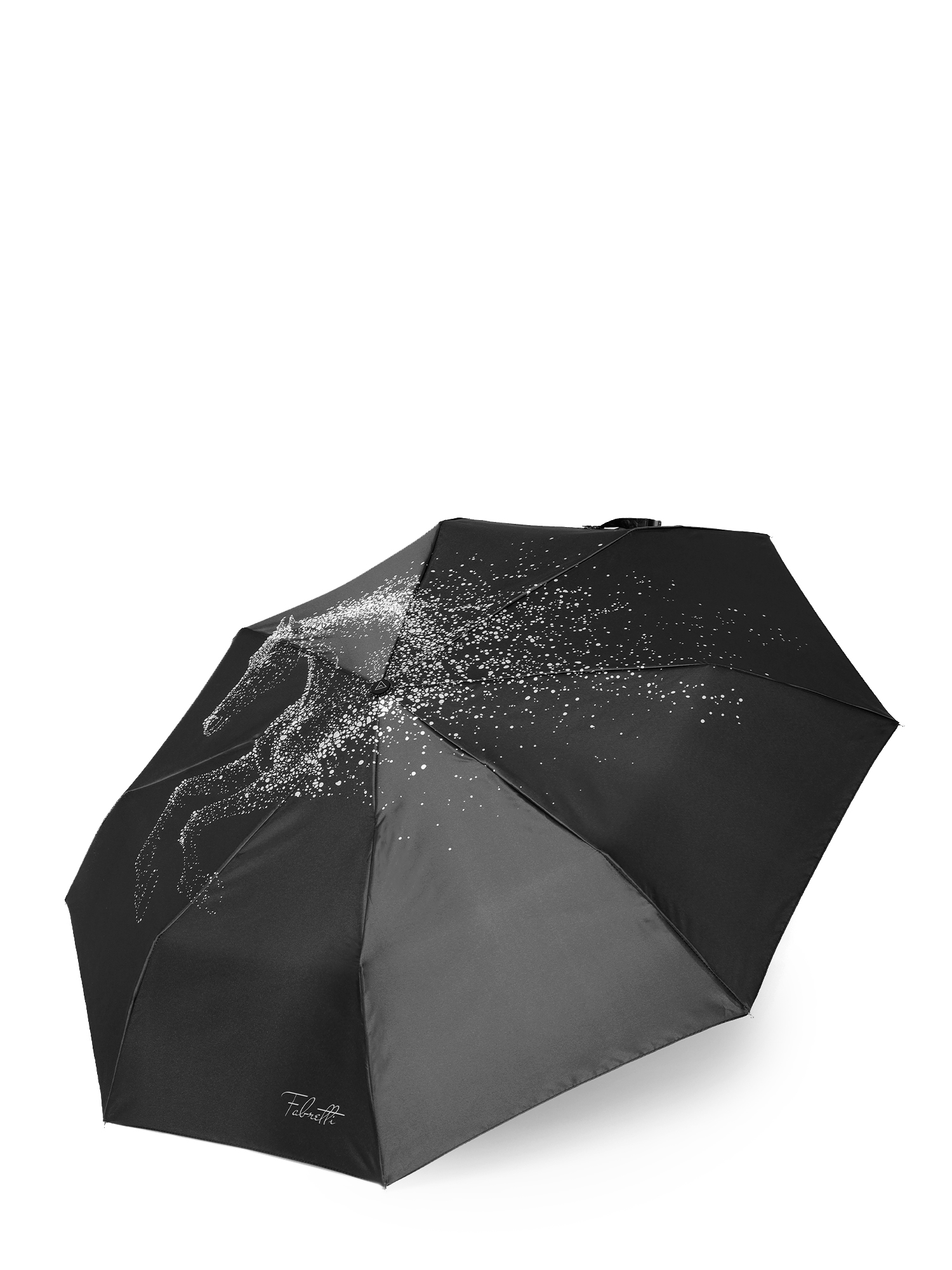 Зонт-автомат тройного сложения итальянского бренда FABRETTI украшен романтичным принтом в виде звездной лошади, бегущей по черному ночному небу. Купол выполнен из гладкого искусственного сатина с шелковистой фактурой и мягким блеском.
